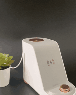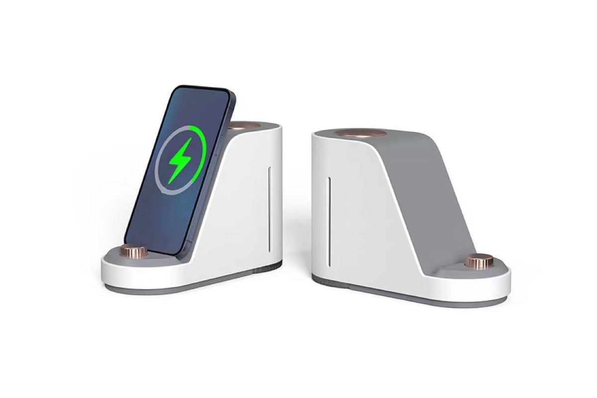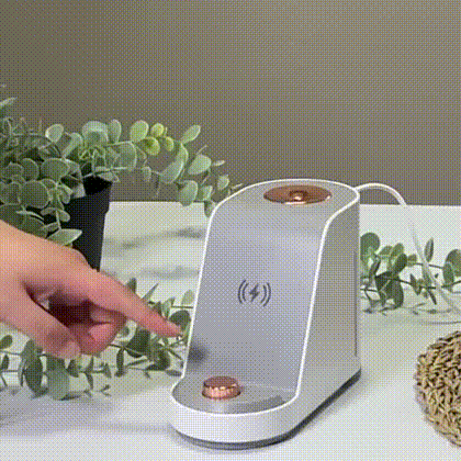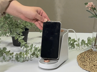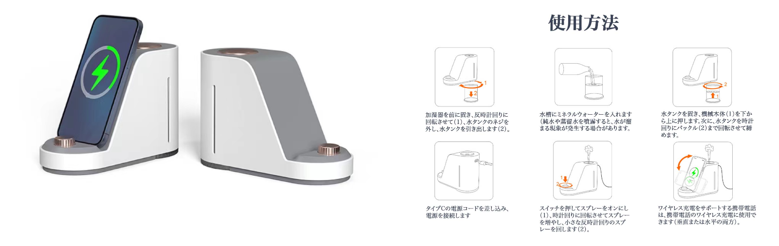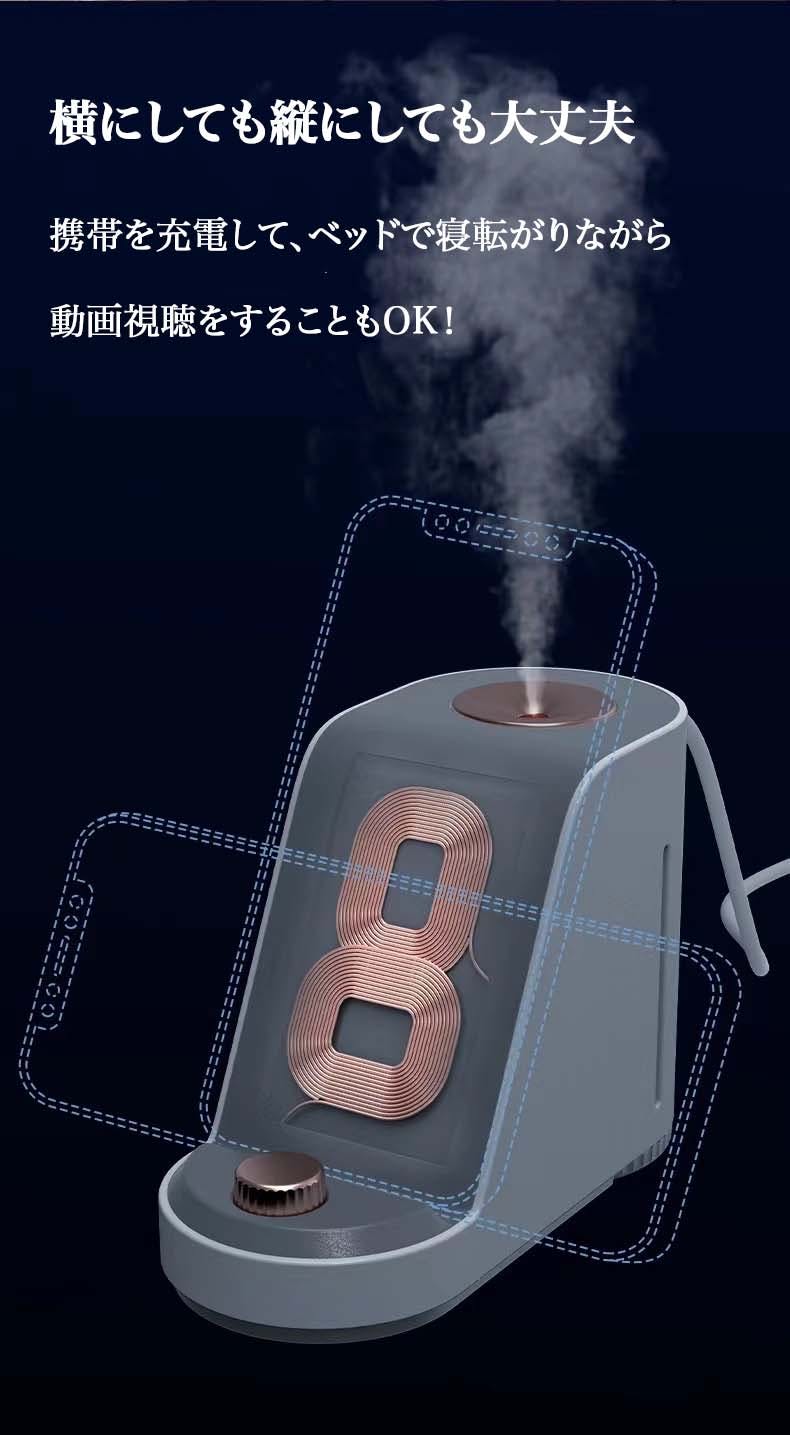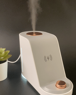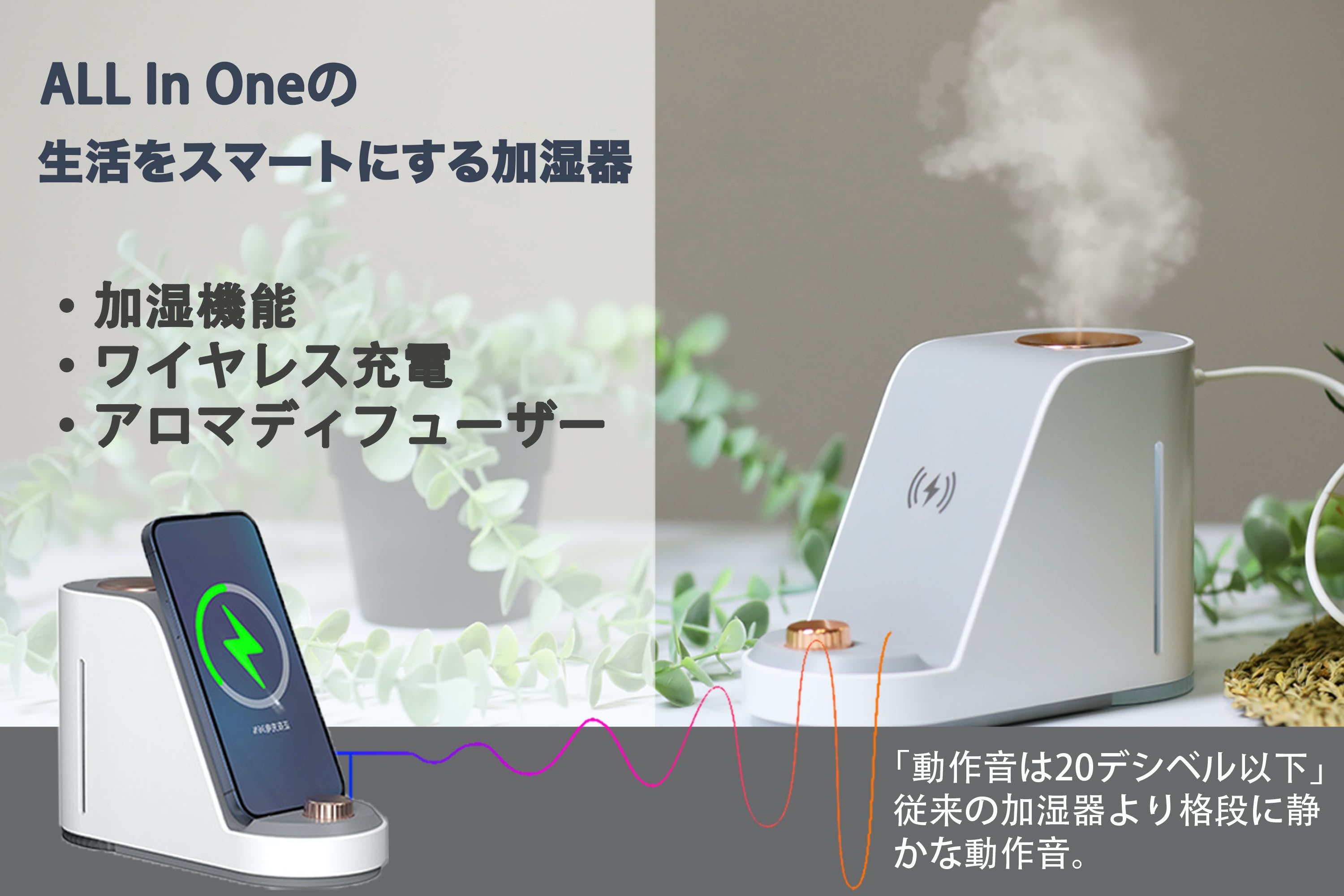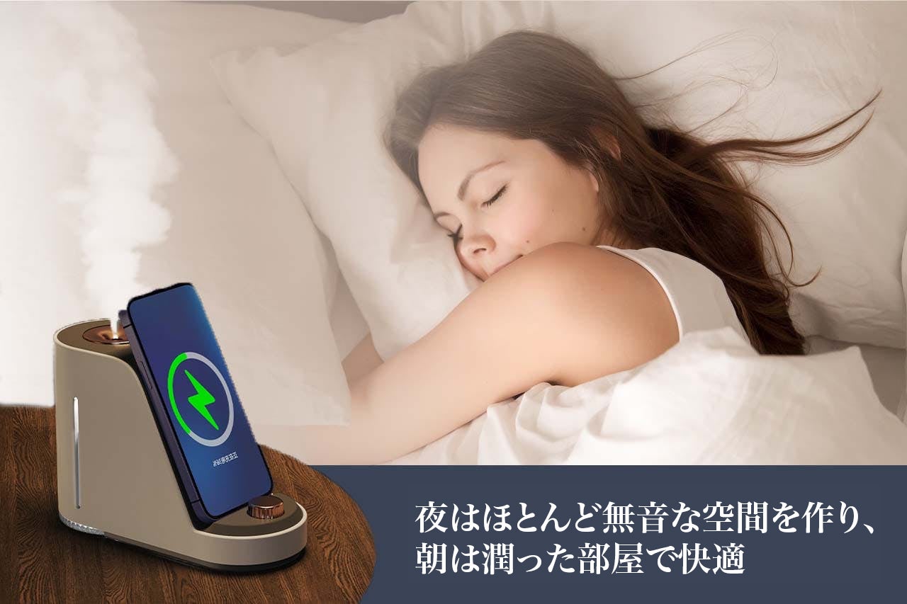 ① ワイヤレス充電器と加湿器の一体化により寝室もこれですっきり!