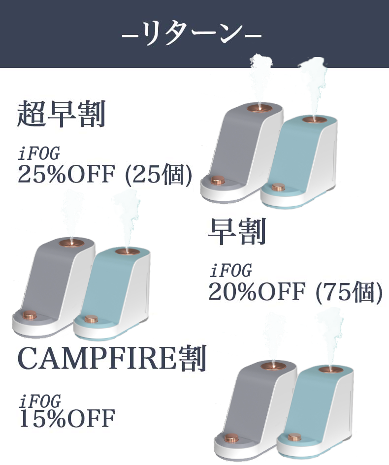 - iFOGは「ワイヤレス加湿器」、「加湿器」、「アロマディフューザー」、「スタンド」を兼ね備えたこれまでにない加湿器です。