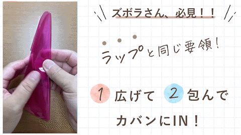ズボラップの中央に入れたいものを好きなだけ入れてラップみたいにくるっとまとめてカバンに突っ込むだけです!