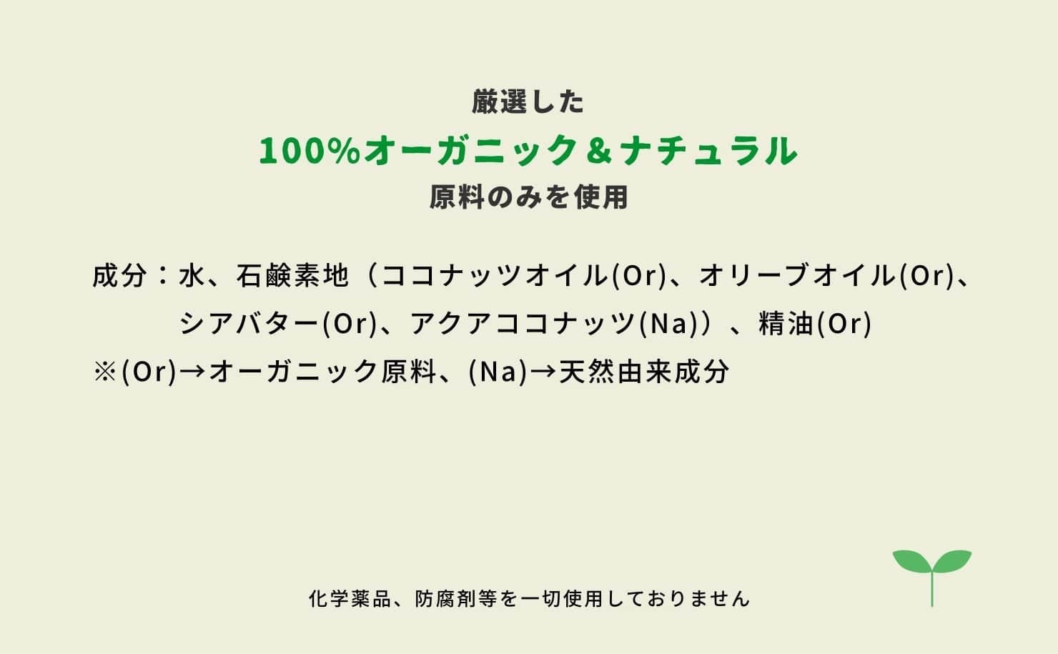 海外から直接仕入れたオーガニックの植物オイル(ココナッツオイル・オリーブオイル・シアバター)や、フードロス削減の取り組みとして期限切れ間近のオーガニック油脂を有効利用。その他、ココナッツオイル由来の乳化剤と、香りには精油をブレンド。シンプルな成分だからこそ、一つ一つの原料の良さが引き立ちます。