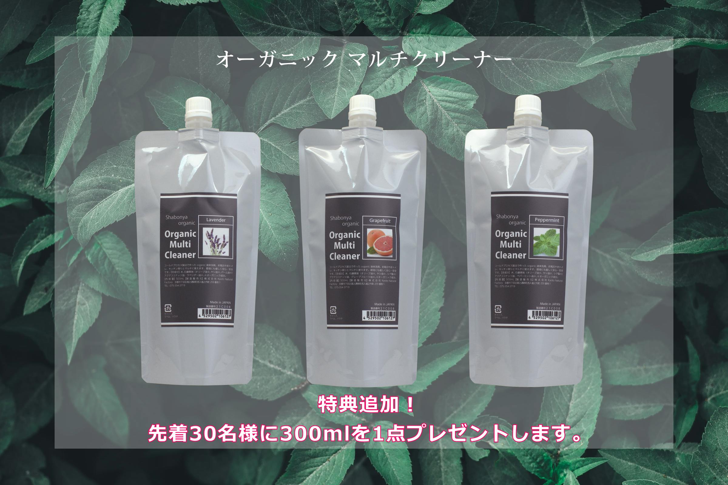 先着30名様に「Organic Multi Cleaner」の300ml(アルミパウチ入り)をお付けします!
