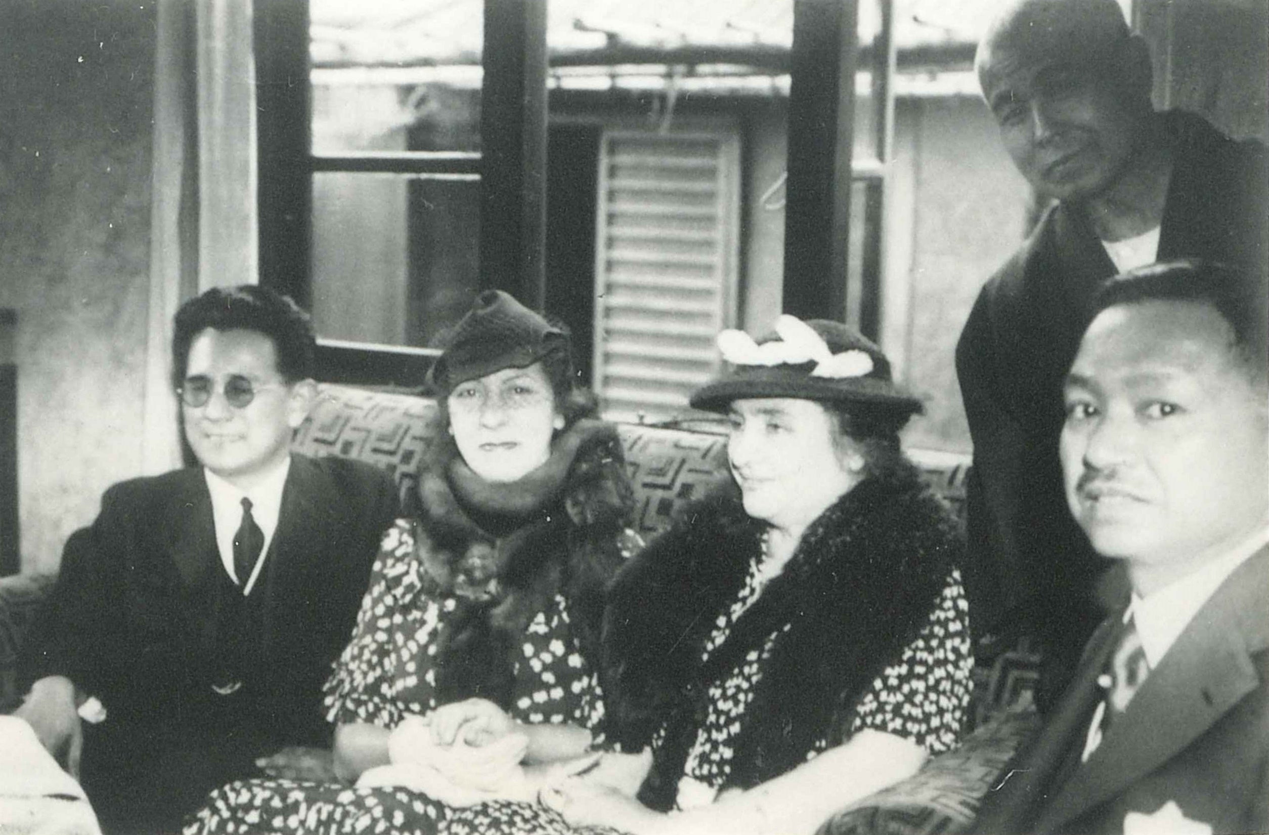 一燈園を訪れたヘレンケラー(前列右から2人目)、左端に岩橋武夫、後列右に西田天香
