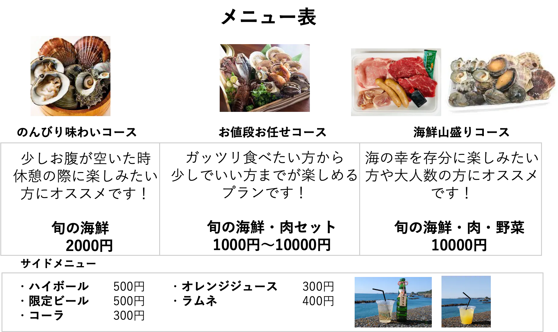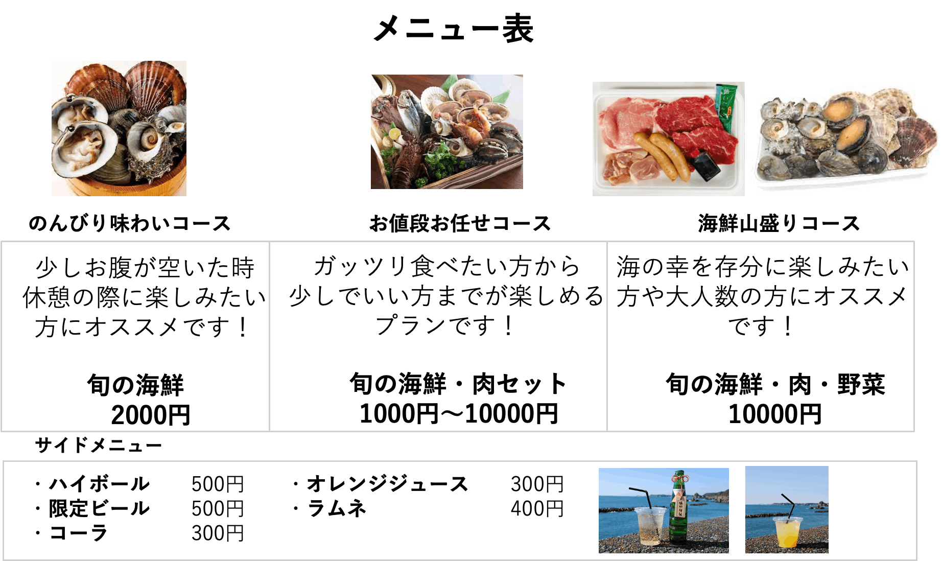 ざっくりとしたメニュー内容ですが、確実に提供出来る物からスタートしていき、その中で量を増やしたり、商品の追加をしていきたいと考えています。また、今後はお客さまに対して体験なども提供できるようなプランも考えています。