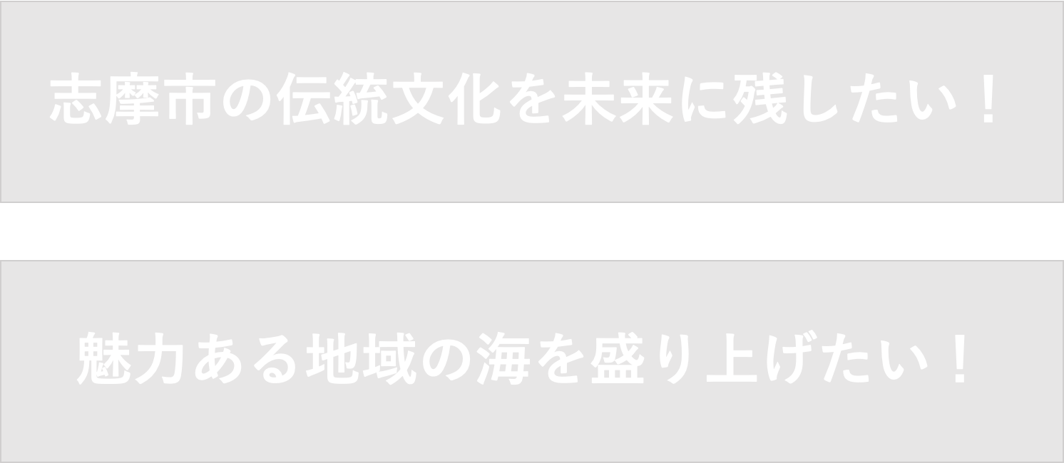 三重県志摩市は海と景色が最高な場所であり、海の幸が豊富。しかし近年第一次産業存続の危機に迫っている。地元大学生の僕が仲間と共に、この問題解決に取り組み、地域内外の人たちが志摩市の伝統文化について知ってもらえるきっかけとなる場所を作ることを目指します!応援よろしくお願い致します。