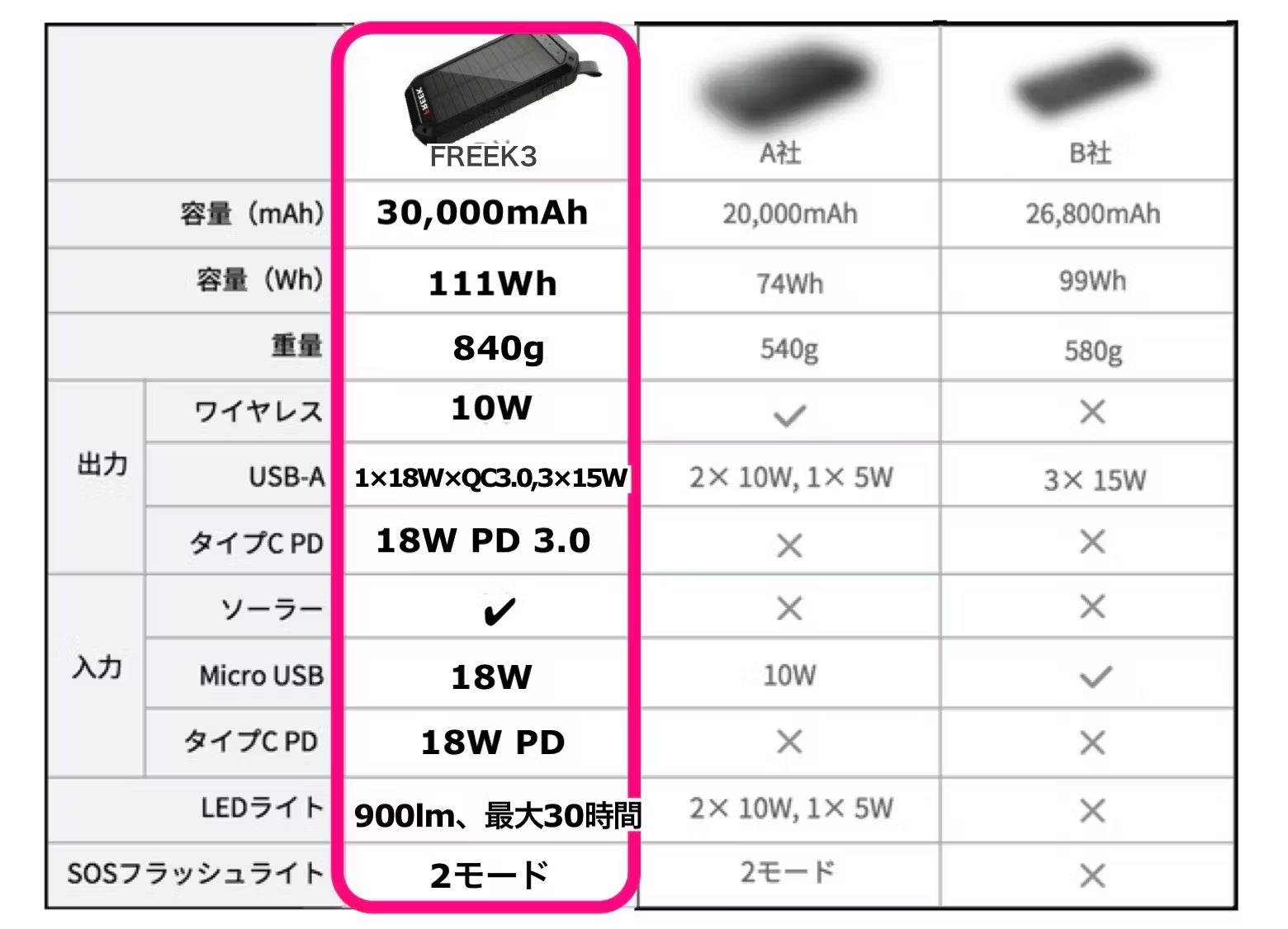 Q: 本体のソーラーパネルを利用して太陽光で本体を充電するにはどれくらいの時間がかかりますか?A:FREEK3は容量が30,000mAh(111Wh)もあるため、太陽光のみでフルチャージするには、かなりの時間がかかってしまいます。ご家庭でのUSB充電を推奨いたします。もっとも、太陽光だけでも、LEDライト分の電力は発電できます。