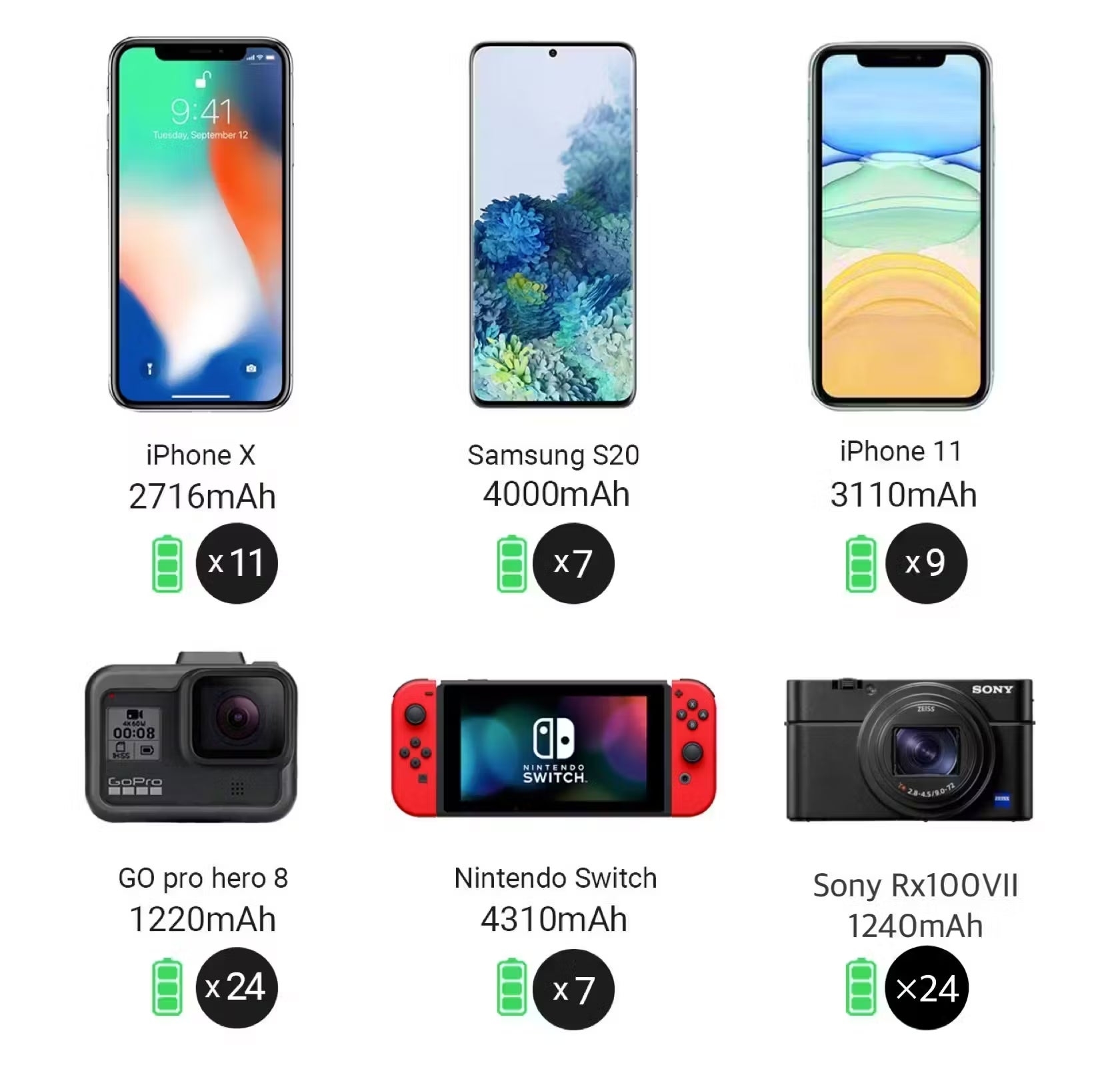 30,000mAhと大容量の高性能ポリマー電池を搭載し、スマートフォンを最大9回もフル充電できます。