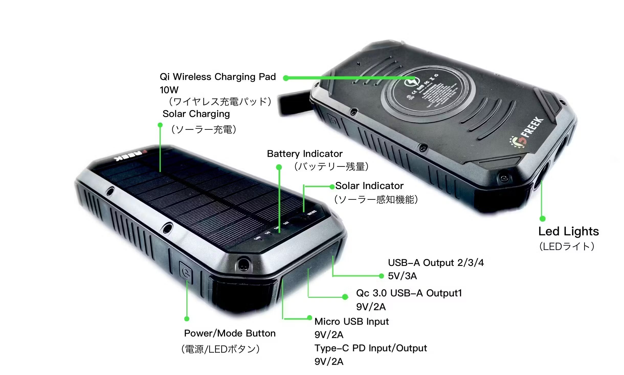 FREEK3は、ビジネス、アウトドア、緊急時にも様々な機能を発揮できる最高のパワーバンクです。毎日のモバイル充電やアウトドアアクティビティ用に設計されており、手持ちで持ち運べるサイズに「高速PD 3.0ポート」「内蔵ソーラー充電器」「10Wワイヤレス充電器」「30時間のLEDライト」「SOS懐中電灯」を搭載、FREEK3があれば充電に困ることがありません。