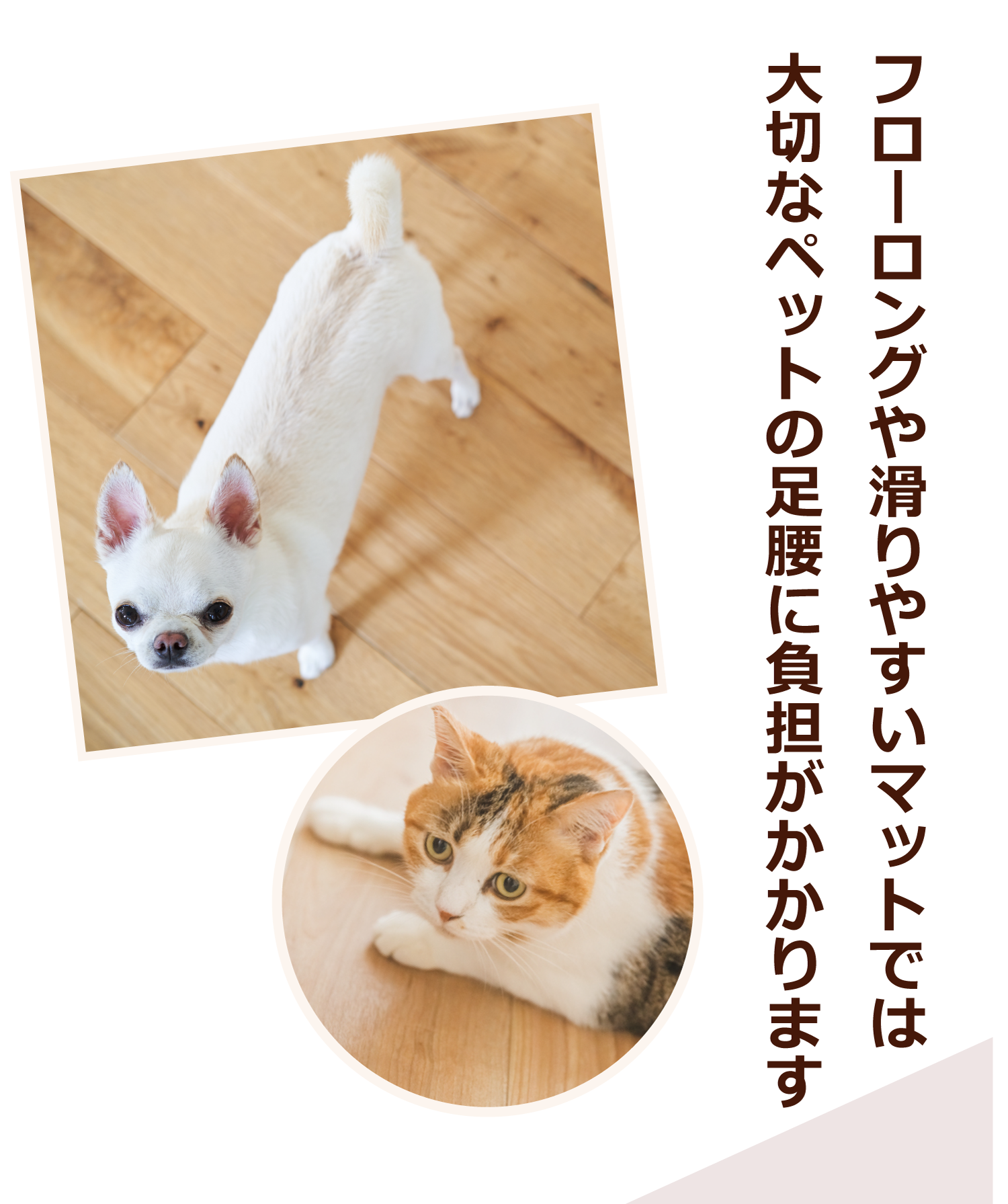 ツルツル滑るフローリングは、大切なペットの骨・関節のケガを引き起こすキッカケになる場合があります。年齢を重ねたペットにはもちろん、まだ若いから大丈夫というわけではなく、いつまでも健康に過ごせるよう小さい頃からの予防が大切です。