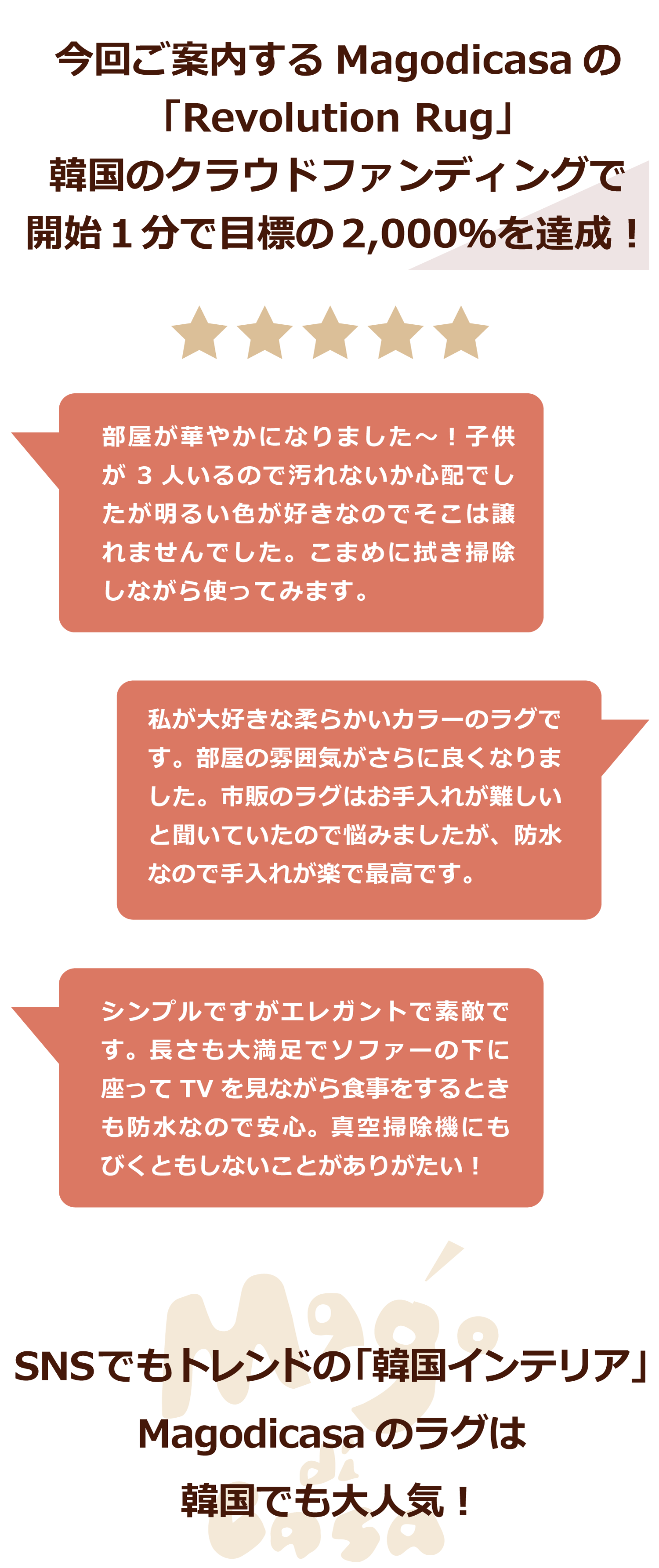 Magodicasa のRevolution Rug を通じて1人でも多くの方に、おうち時間を快適にそして笑顔で過ごしていただけることを期待しております。