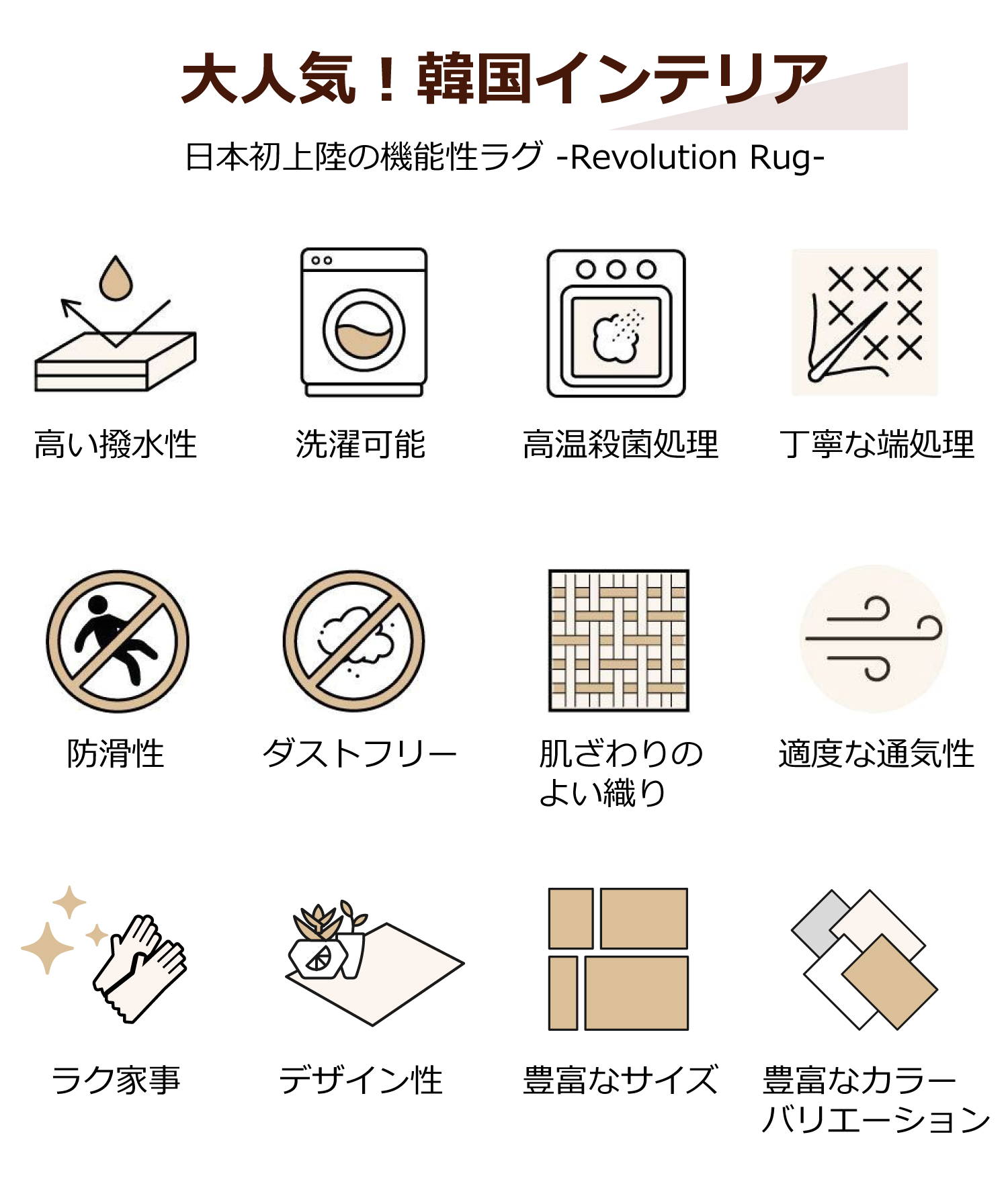 A, 撥水加工は高い熱を与えることで低下する可能性が高いため、表面温度が高い電気カーペットと使うことはおすすめは出来ません。床暖房につきましては表面温度が体温以下のため、使用していただいて全く問題はございません。床暖房を使っているご家庭の多い韓国でもRevolution Rug はご好評いただいています。