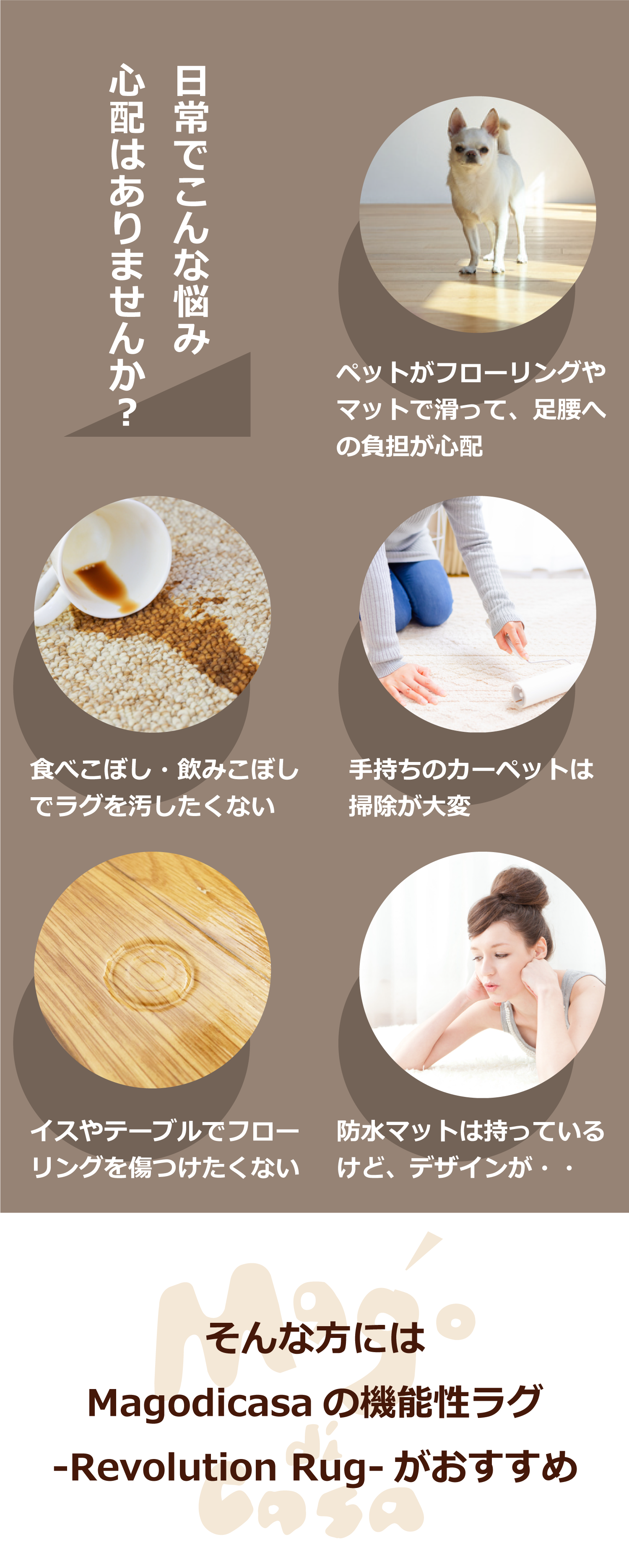 フローリングはお子様・ペット・ご年配の方には特に滑りやすく、とは言え床全体を張り替えるには金銭的に大きな負担が発生する日本の住宅環境を考慮すると、このRevolution Rug はより良い選択肢の一つであると確信しております。