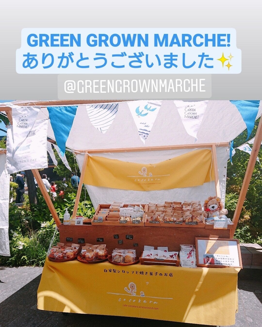 先日5/3(火)は、毎週火曜日12:00〜16:00に立川のグリーンスプリングス2Fにて開催しているGREEN GROWN MARCHE!にcocokaraも焼き菓子販売という形で出店させていただきました!