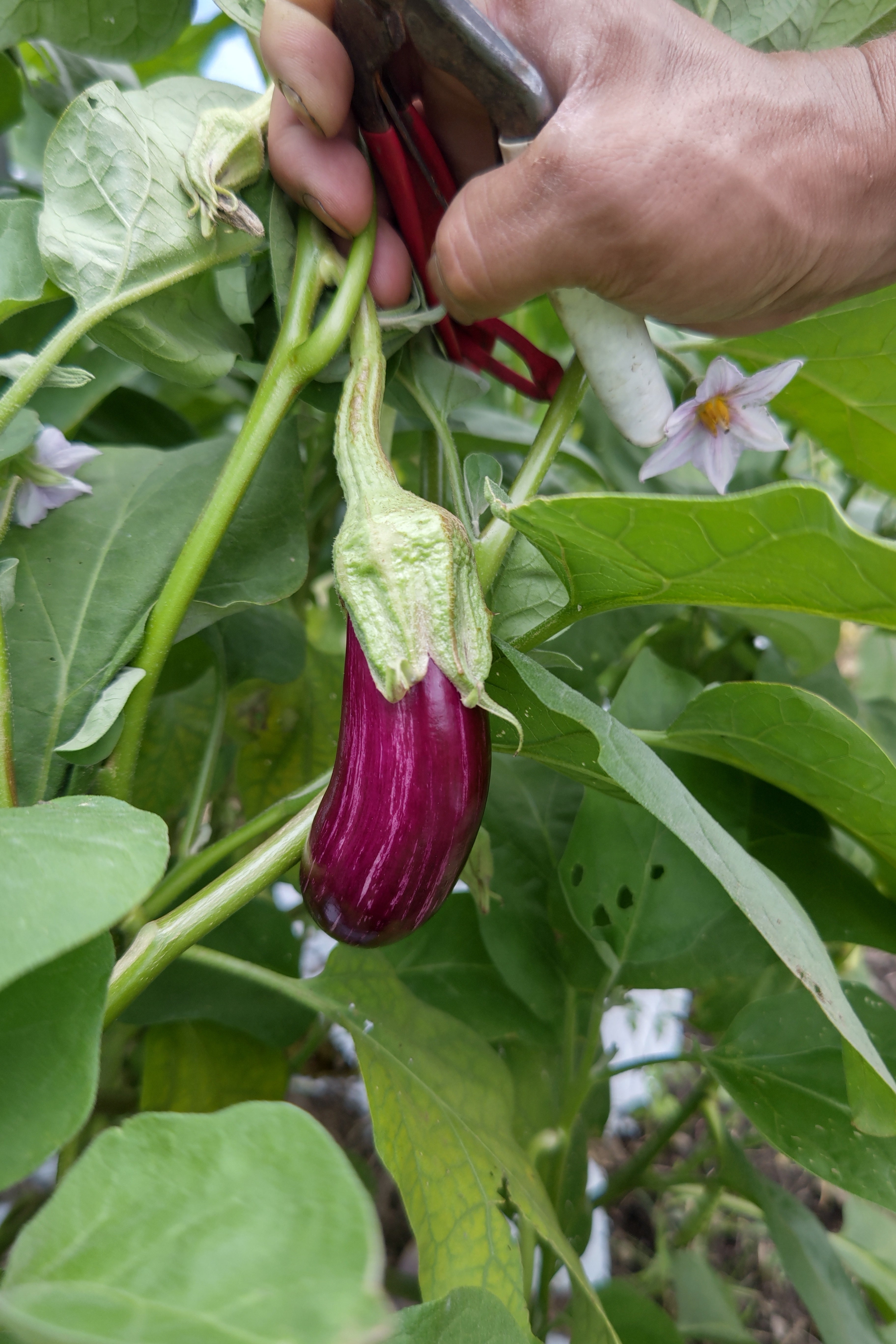 ナスは、夏の間は種も目立たず大きく育てますが、今の時期から秋くらいになると、ナスたちは種を残そうと必死。だんだんと種が目立つようになるため、早めに収穫するんだそうです。