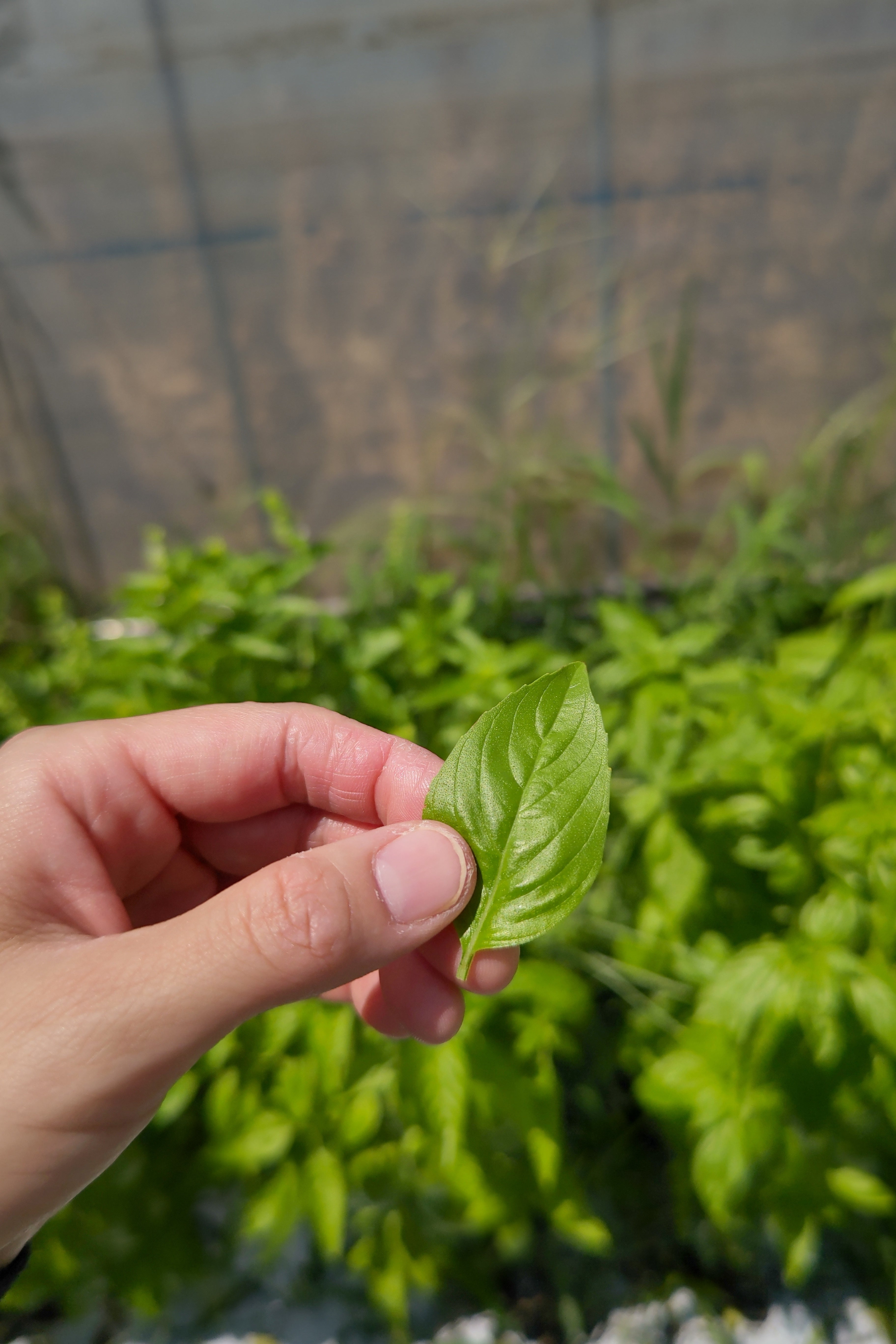 何種類かのバジルを育てていて、珍しい香りの強いスパイシーなバジルを摘んで食べさせていただきました!