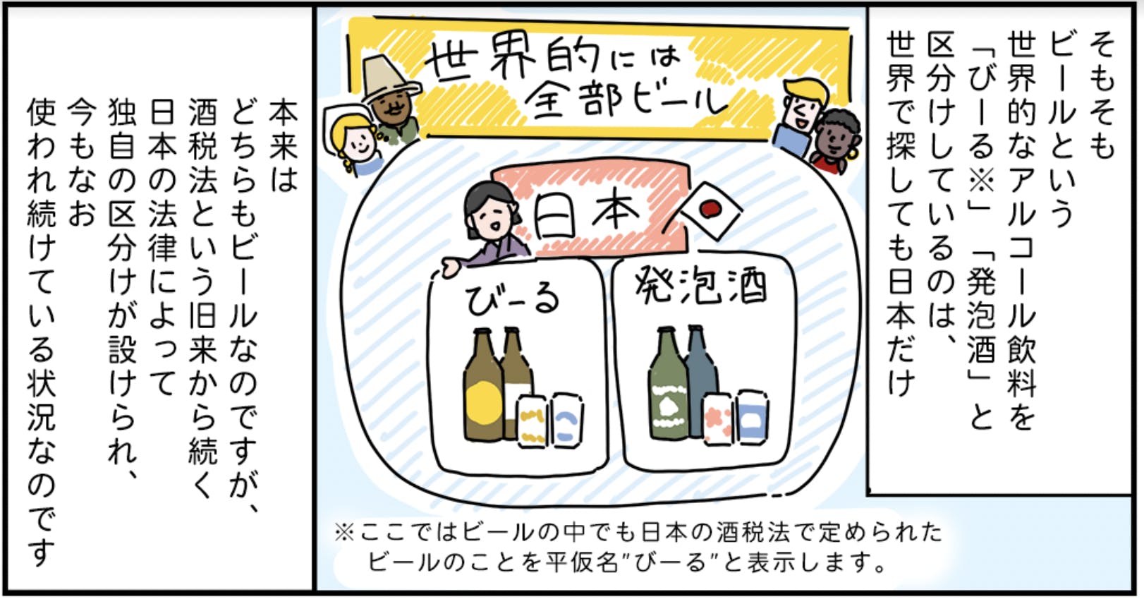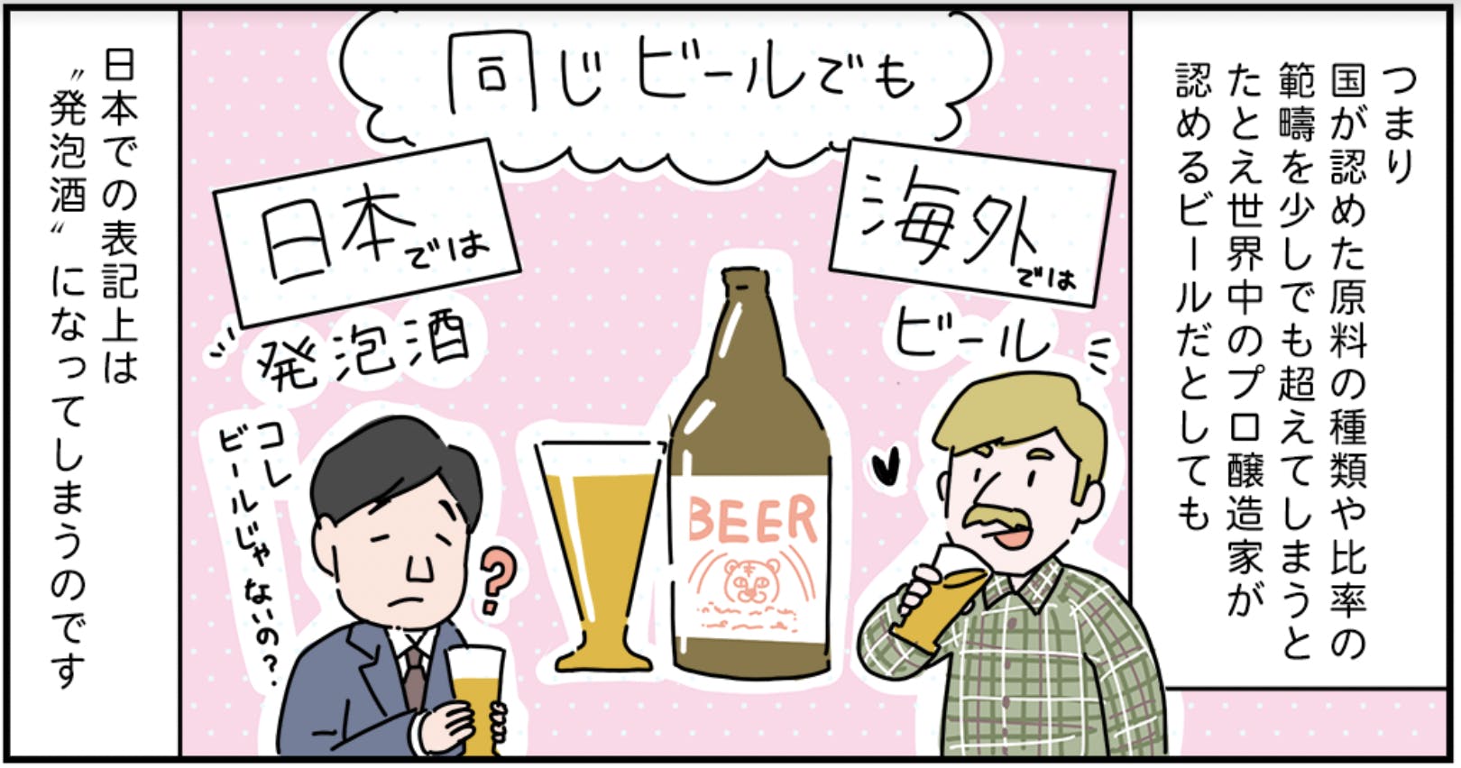 私たちが作るビールの品目は「発泡酒」に該当します。「ビールじゃなくて、発泡酒なんかい!」と驚かれる方がいるかもしれませんが、実はクラフトビールの多くは発泡酒です。その理由もSNS漫画「えとう君のビール絵日記(ビールなのに発泡酒?)」より一部参照します。