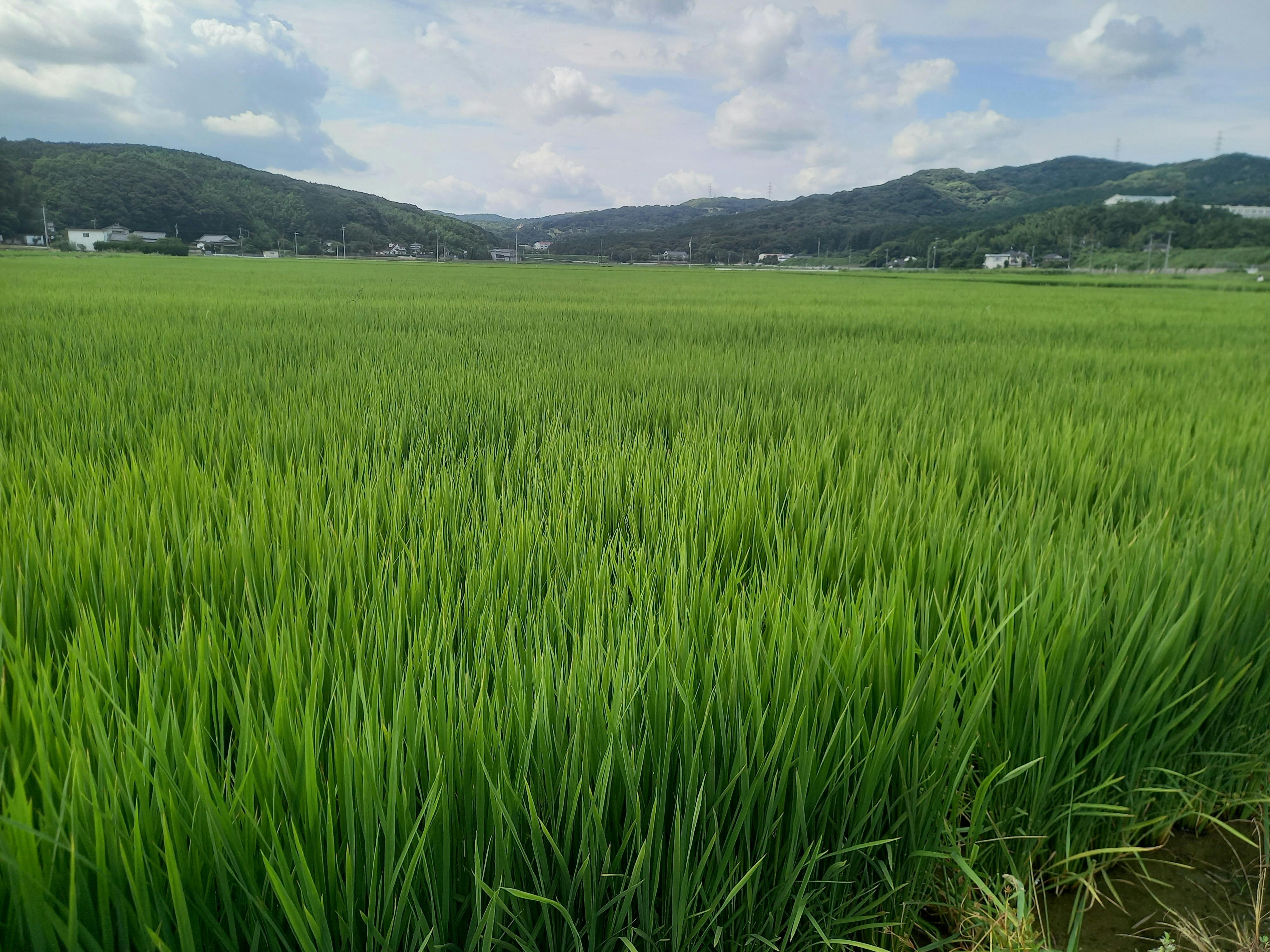 真夏の暑い陽射しが、中干しを終え、根を深く細やかに張り巡らせた『ふくのこ』に、肥料と水を再び与え、これからの充実した出穂を促します。日に日に成長する『ふくのこ』に語りかけるかのように毎日、朝夕、田んぼを見守り続けておられます。分けつの張り具合、葉の色などなど私には見えない、状態を観察し自然環境天候を見据えながら育てる。美味しい米づくりにとっては、当たり前の事と言われますが、長年の経験が有ればこそ、手を抜かづ、気づかぬ稲の成長の変化にいち早く察知し、労わっておられます。当たり前に深く深く感謝いたします。