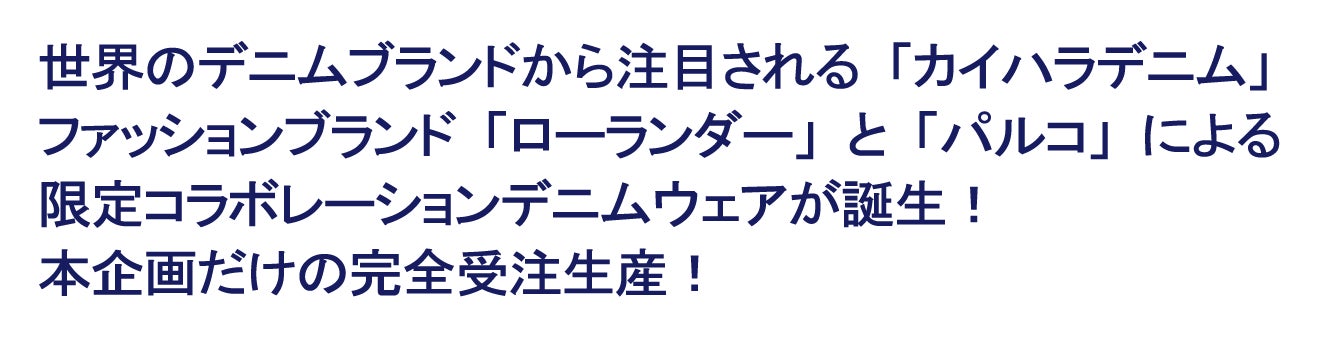 世界のデニムブランドから注目されるデニム生地のプロフェッショナル「カイハラデニム」、リメイクを中心に活動するファッションブランド「ローランダー」。この「カイハラデニム」「ローランダー」と「パルコ」の3社が企画制作した限定コラボレーションデニムウェアの受注会を開催いたします。今回ご用意したアイテムはパッチワークを施したデニムシャツです。3種類のデザインからお選びいただくことができ、完全受注生産のため本企画のみで購入することができる限定商品となります。