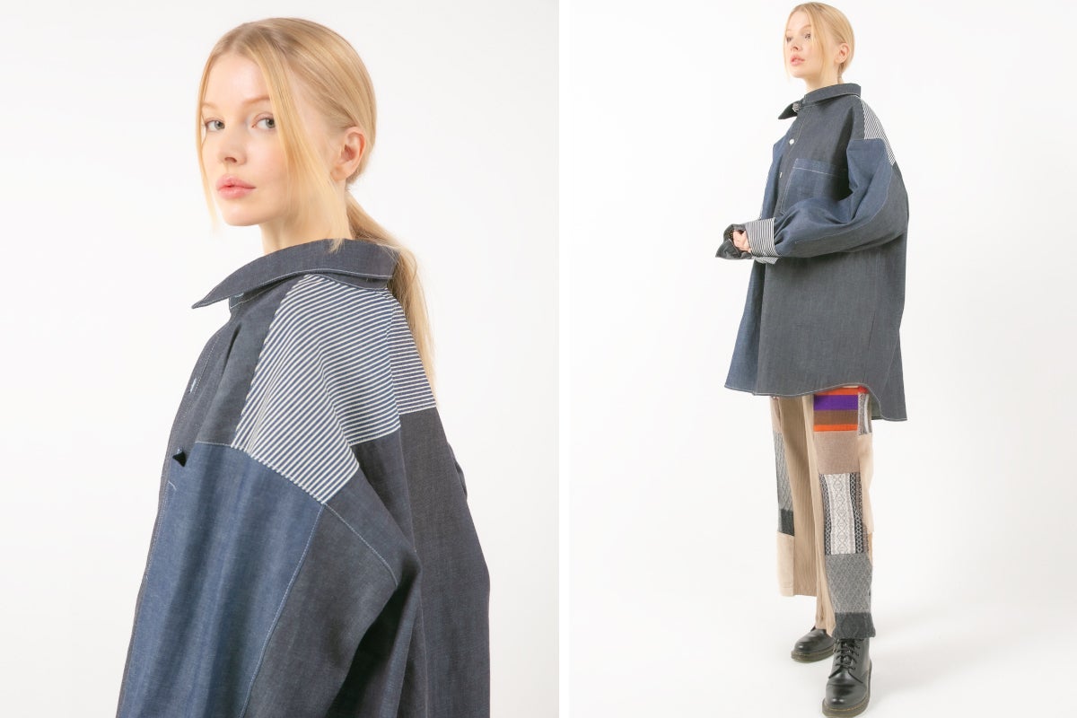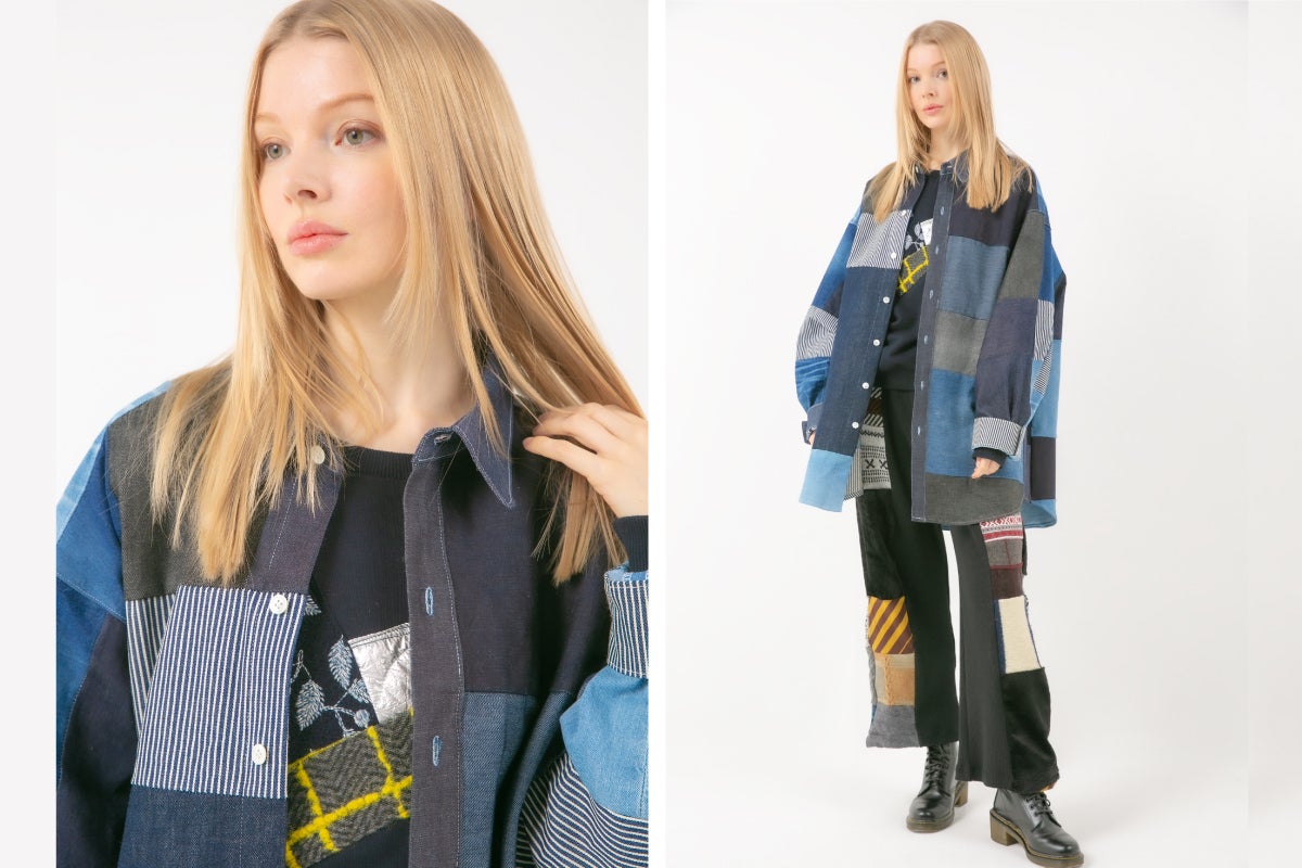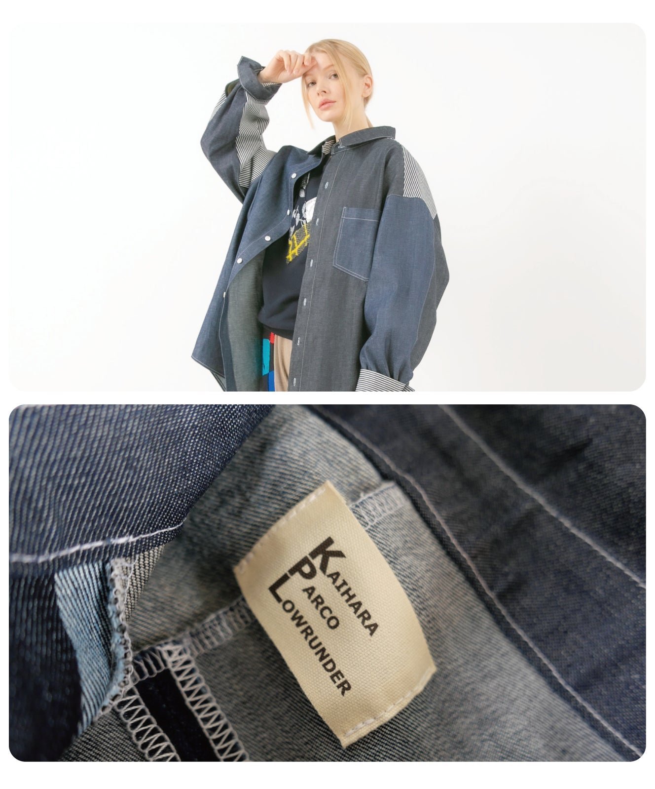 リメイクを得意とするデザイナー「ローランダー」の、真骨頂とも言うべきデザイン。カイハラデニム提供の生地見本ストックを最大限に活かし、デニムが見せる様々な表情を1着のシャツに折り込む、究極のアップサイクルファッションです。
