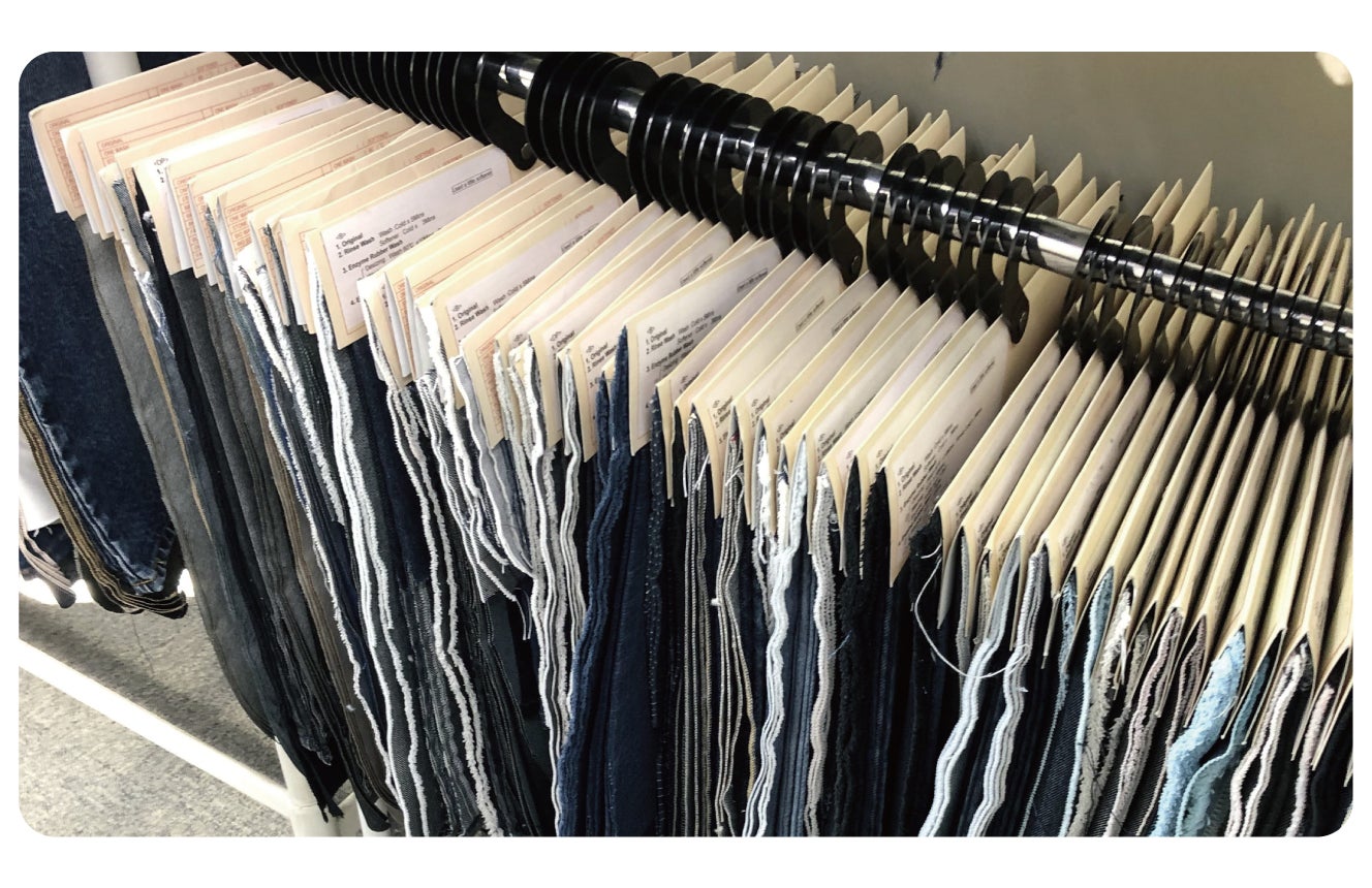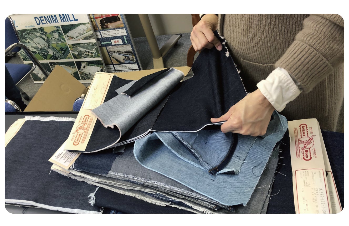 そしてカイハラデニムからは、驚きの提案が飛び出しました。それは、「カイハラデニムがお得意様と商品作りをする際に使用してきた膨大な生地見本ストックの一部を、今回の商品開発に特別に提供する」というものでした。「これなら、いろんなバリエーションのデニム生地を使って、商品作りができる。」デザイナー ローランダーの商品制作に対する意欲も高まりました。そしてカイハラデニムから商品作成用のデニム生地が到着してローランダーは商品サンプルの制作にとりかかり、ついに3社のコラボレーションデニムウェアが完成しました。