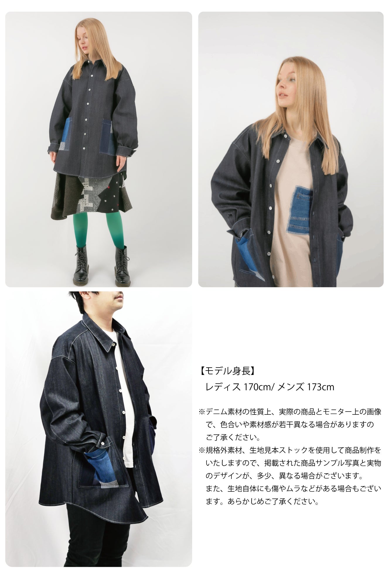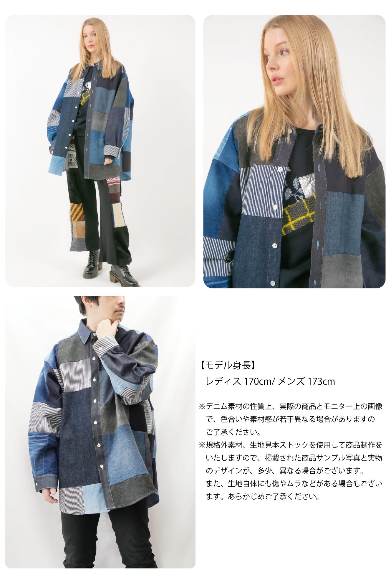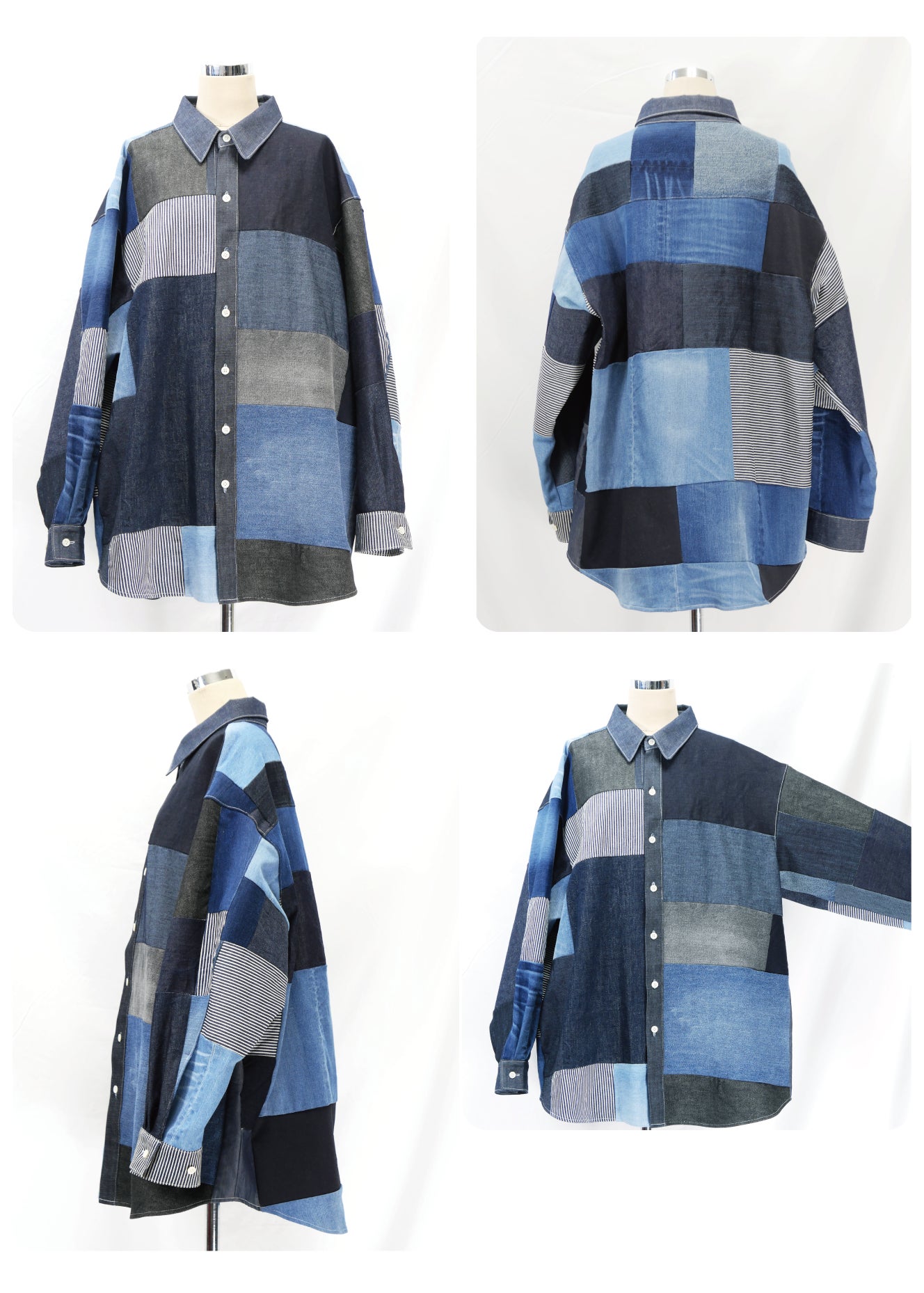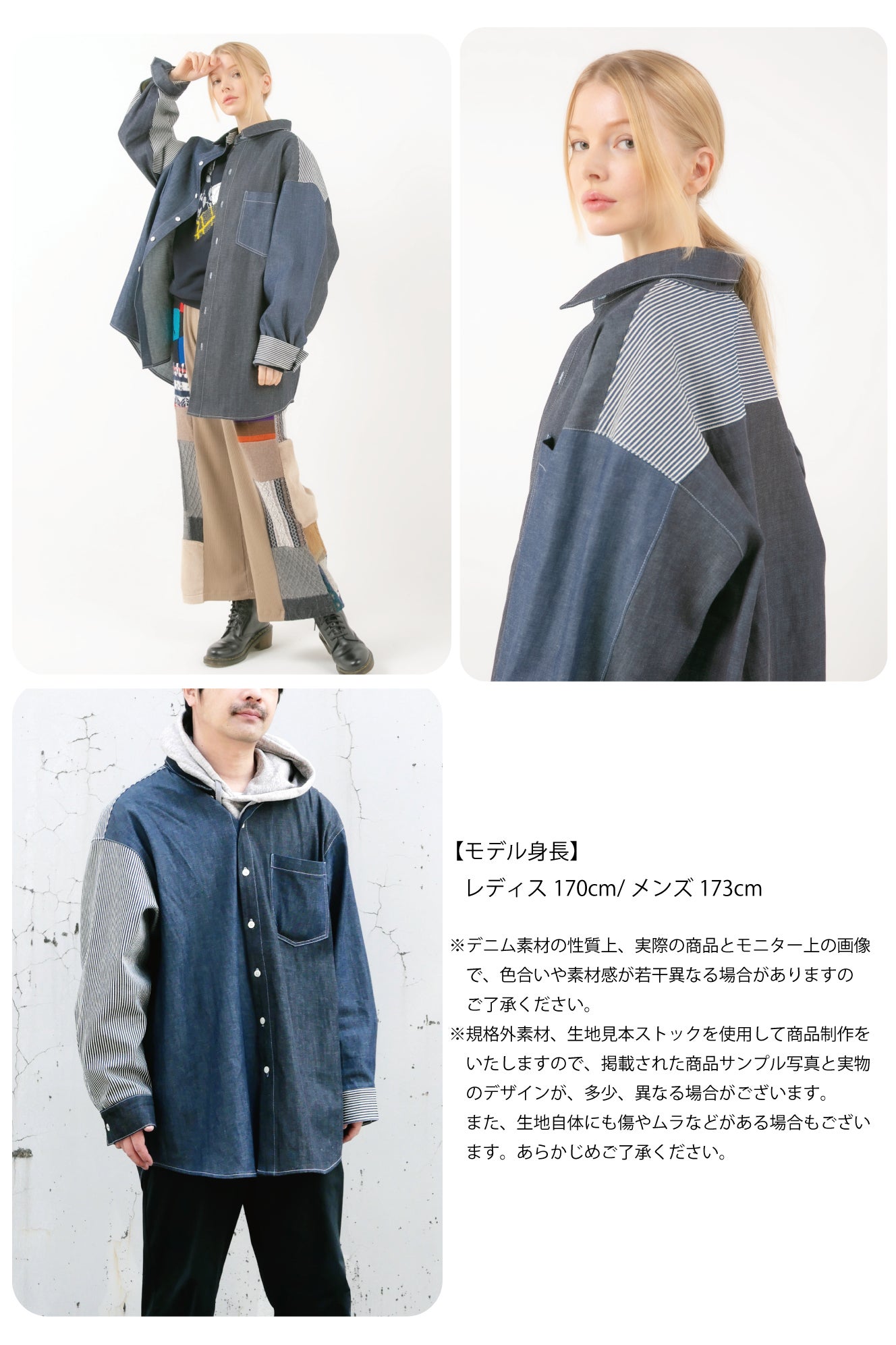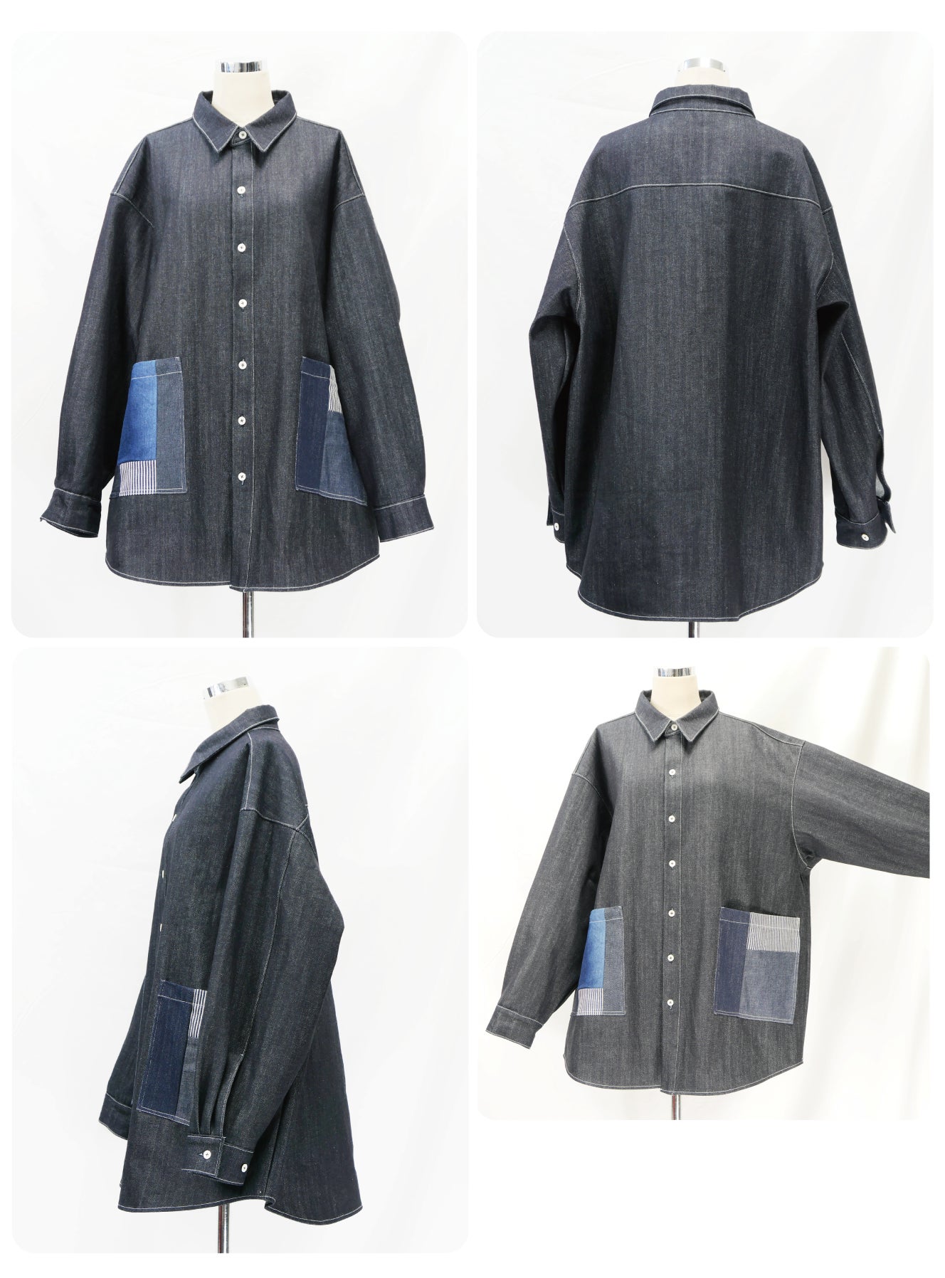 今回の商品内容としては、2022秋冬に対応した、アウター想定のデニムシャツで、ユニセックス/ノンエイジ、オーバーサイズのM・L 2サイズ、デザインは3種類 のパッチワークで展開。