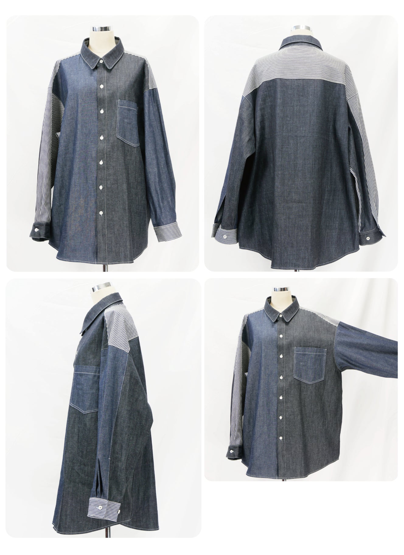 シャツの前身頃、袖、肩~背面、胸ポケットなどのパーツで生地を大胆に切り替え、デニム生地の微妙な色/質の違いを楽しむことができるデザイン。ヒッコリーストライプを効果的に配置しています。