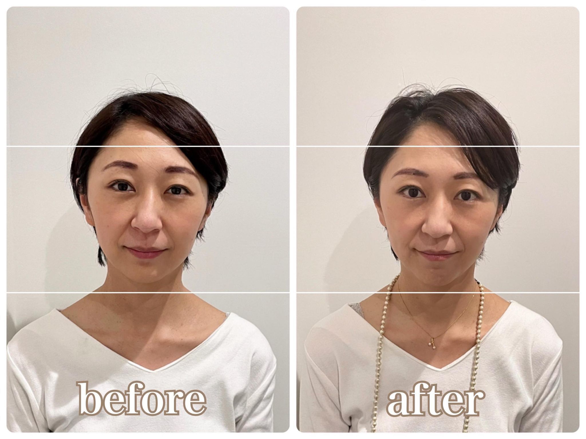 ビフォーとアフターでは、お顔の「たるみ」や「目の印象」など、全体的にかなりスッキリとしているのがわかると思います。生体電流による施術のメリットはこれだけではありません。たるみにアプローチできるのと同時に、ストレスケアや脂肪燃焼もサポートいたします!