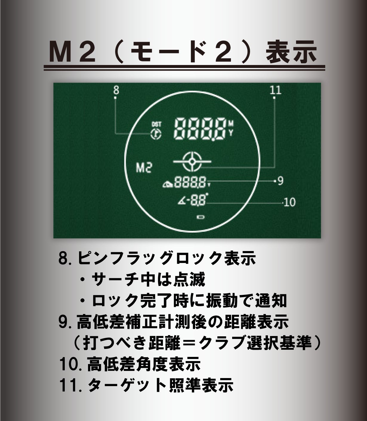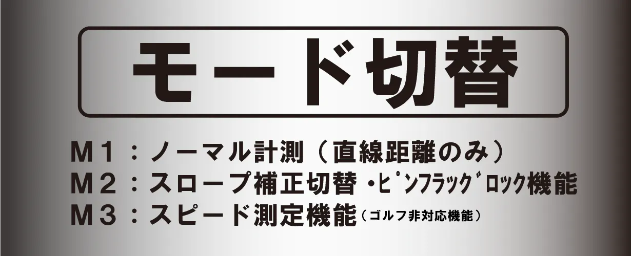 グリーンを狙うまではモード1での高速瞬間サーチを利用し、ピンを狙う際はモード2を利用することが上手な使い方となります。
