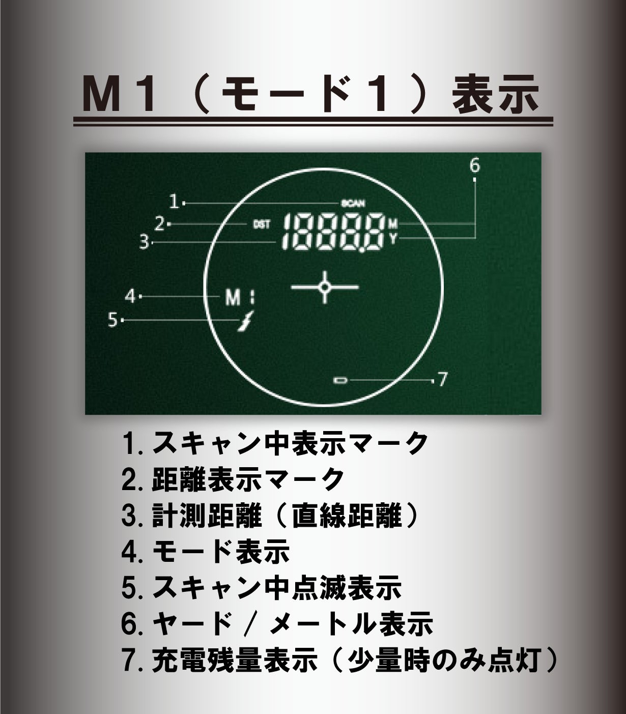 モードボタン②を長押しすることで、メートル・ヤード表示が切り替わります。