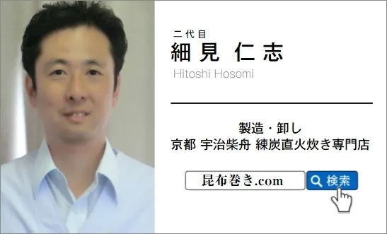 プロが選ぶ練炭直火炊き専門店「宇治柴舟」二代目の細見仁志と申します。宇治柴舟は京都府宇治市を拠点に、高級旅館 ・ホテル向けに業務用「練炭直火炊き昆布巻」の製造・卸しを展開する専門店です。