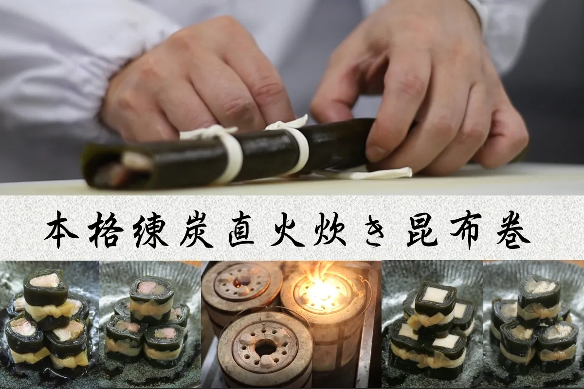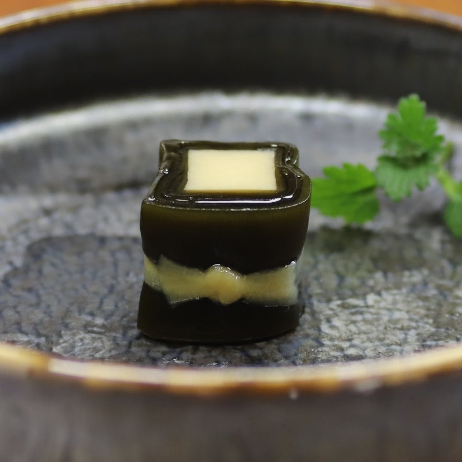 旨すぎてはいけない、主張しすぎない味、それが私たちのこだわりです。特別なコース料理に添えられる一品として召し上がっていただくために、メインの料理を引き立てる上品さをもとめて、北海道根室産一等昆布・練炭直火炊き製法にこだわっています。中に巻いた素材の味が生きた、しみじみとした美味しさを感じていただけます。