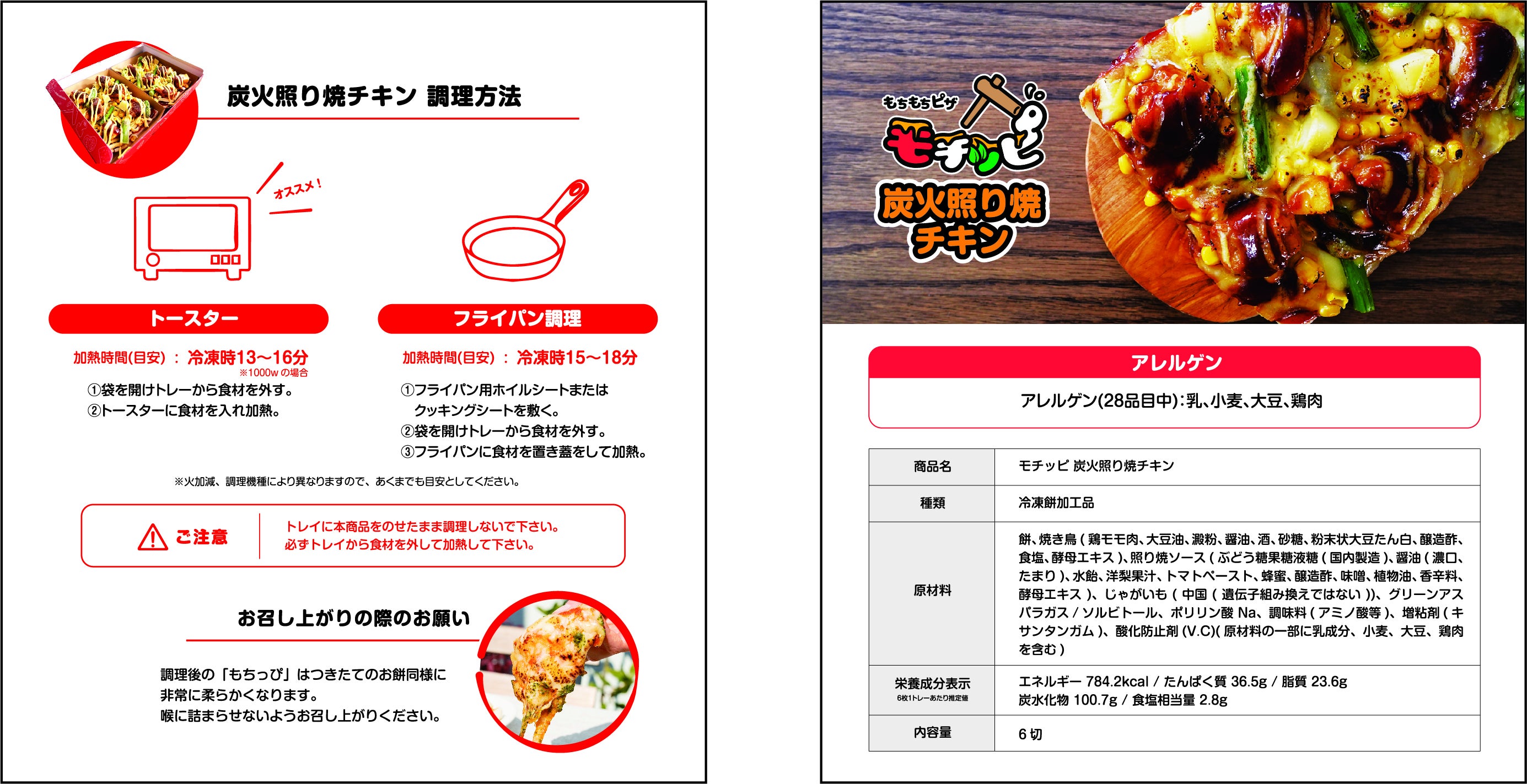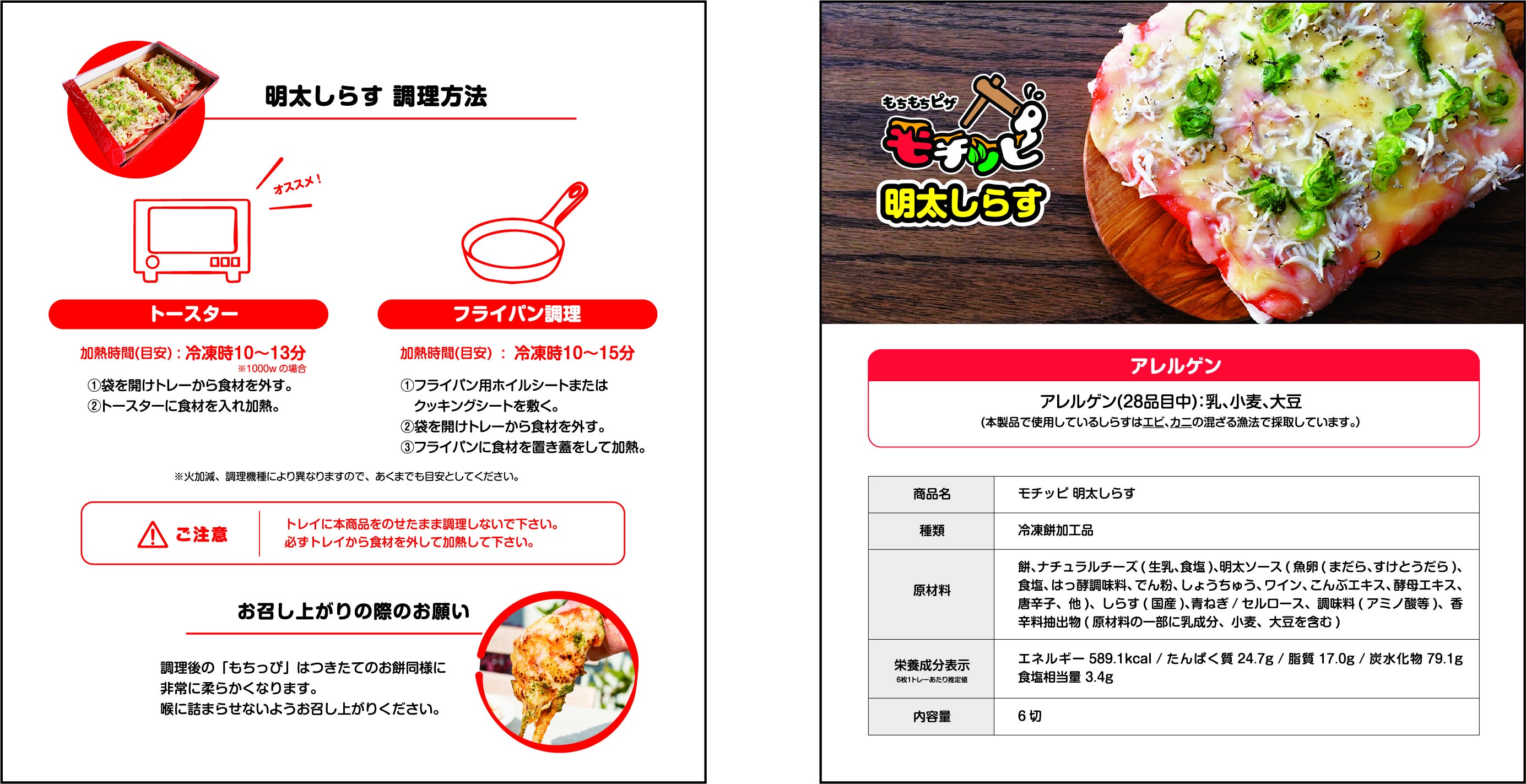 【原材料/添加物】餅、ナチュラルチーズ(生乳、食塩)、明太ソース(魚卵(まだら、すけとうだら)、食塩、はっ酵調味料、でん粉、しょうちゅう、ワイン、こんぶエキス、酵母エキス、唐辛子、他)、しらす(国産)、青ねぎ/セルロース、調味料(アミノ酸等)、香辛料抽出物(原材料の一部に乳成分、小麦、大豆を含む)