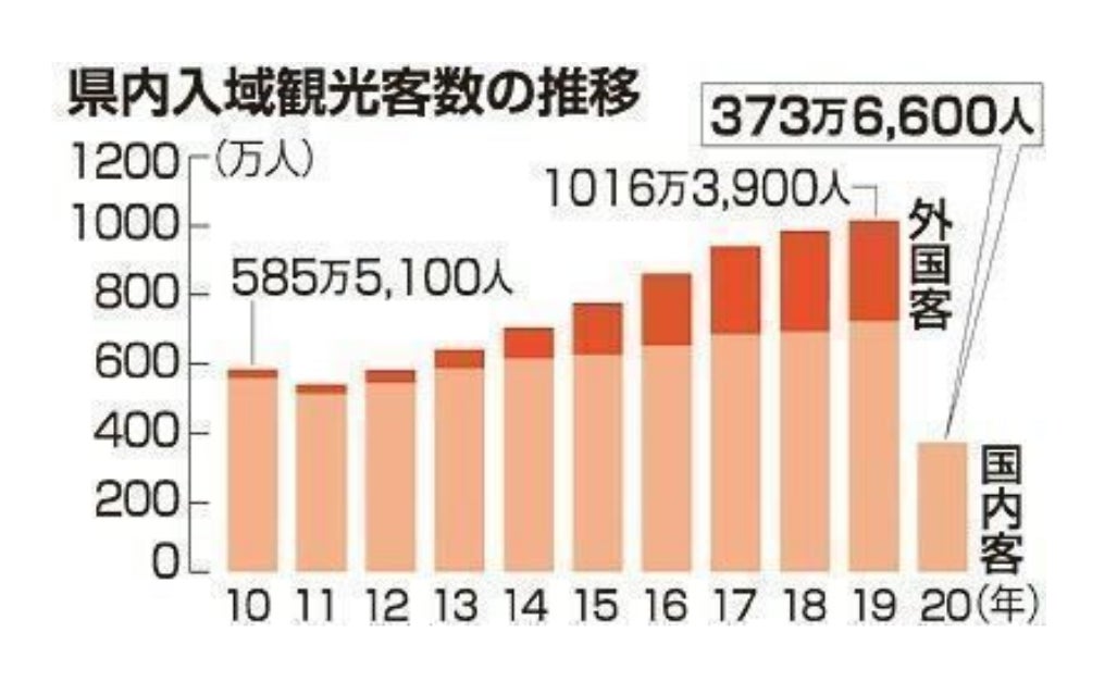ところが、2020年に入り新型コロナウイルスの影響で観光客は激減し、観光収入はピーク時の6割減となりました。