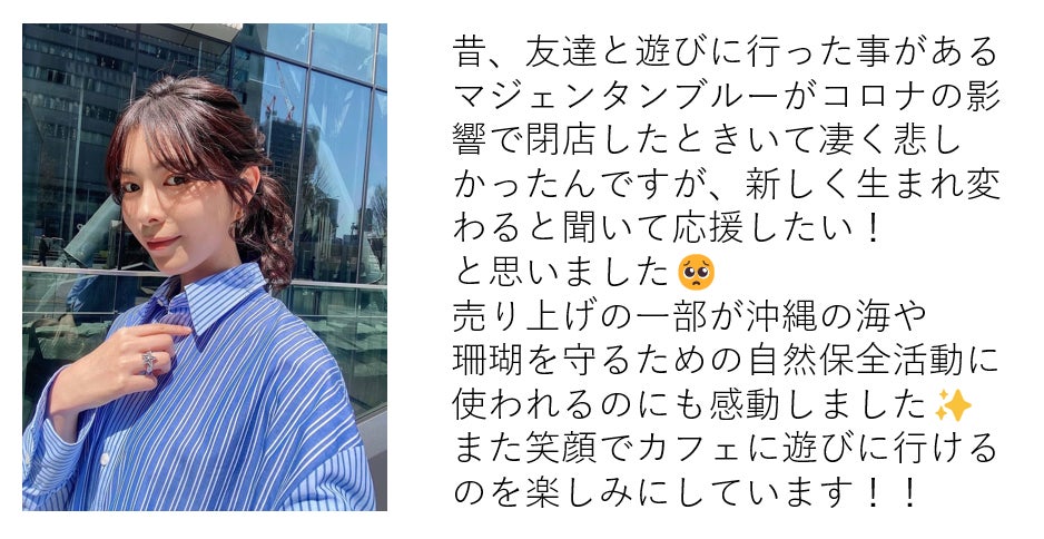 私たちのお店やその周辺が活気づくことで沖縄の自然を壊したくないです。そのため、お店の売り上げの一部は恩納村のサンゴ基金へ寄付し、サンゴの保全活動に利用されます。