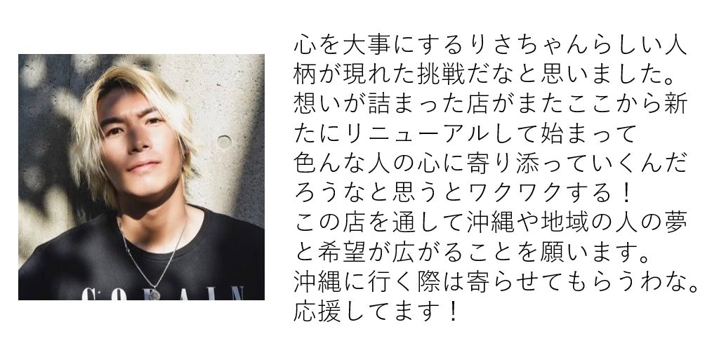 お店を改装して、沖縄の観光スポットになるくらい新しく生まれ変わらせたいと思っています。