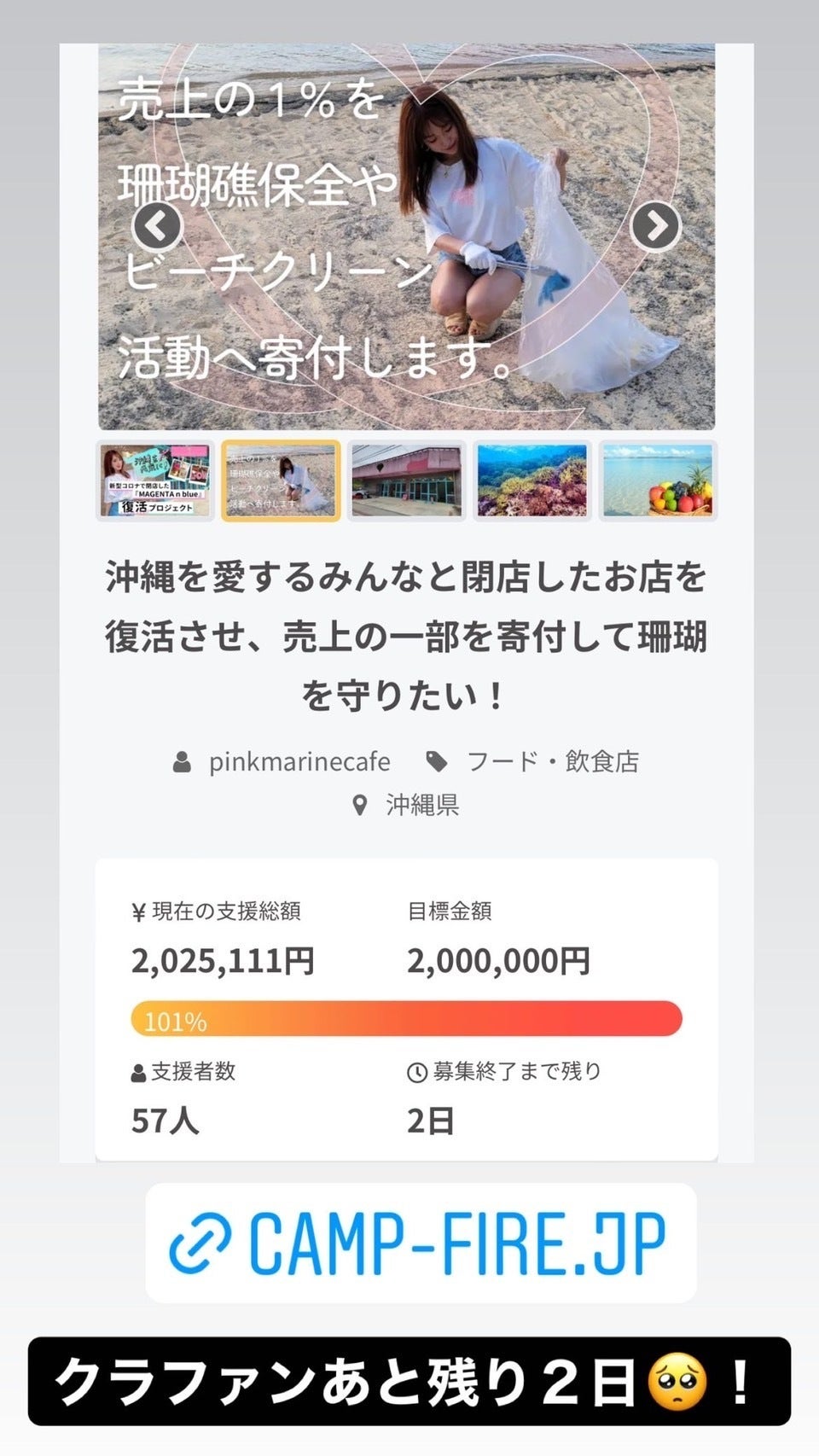 2022/05/21 19:00プロジェクトオーナーのおりさです。5月20日にプロジェクトの目標金額200万円を達成しましたのでご報告致します。ご支援を頂いた皆様、ご協力を頂いた皆様、本当にありがとうございました!!現在、5/26のグランドオープンに向けて、準備を進めております!プロジェクト終了まで残り10日になりました。残りの期間も、閉店したお店の復活のため、沖縄のサンゴ保全に寄付するため、そして、沖縄を元気にするため、プロジェクトにご協力いただけると嬉しいです。最後までご支援ご協力の程、宜しくお願い致します。 もっと見る