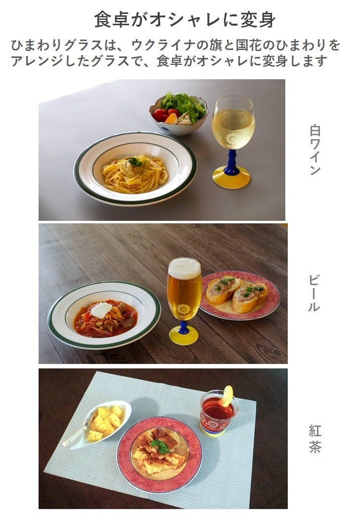 磁器脚にはウクライナの国旗(青と黄)をあしらい、グラスには国花を施した3種類(ワイングラス・ビールグラス・ロックグラス)のシリーズです。