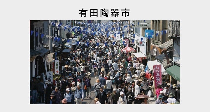 有田は磁器をつくるための道具や絵具、型屋、素地屋、窯元、上絵屋、箱屋等の職人、卸問屋や販売員など様々な専門家が集積している分業の町です。世界でも極めて珍しい磁器の集積地「有田」には国内にとどまらず海外からも多くの方が訪れて交流しています。そして、年1回開催される「有田陶器市」には国内外から100万人以上の人が訪れ、有田は活気に満ちます。(2020年・2021年はコロナにより中止)