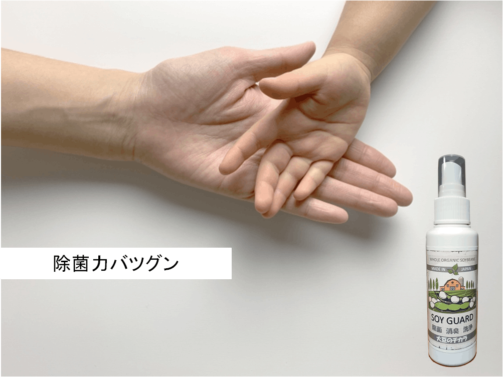 「子供からお年寄りまで、心地よく使っていただける除菌スプレーを作ることはできないものだろうか?」「効果が強力なだけでなく、手肌にもやさしく、何回使っても肌のうるおいが損なわれないものは作れないのだろうか?」「仕方なくするのではなく、スプレーしたくなるような除菌剤はできないのだろうか?」と、様々な考えに妥協なく答えてゆき、ようやくたどり着いたのが、今回ご紹介する『ソイガード』です。