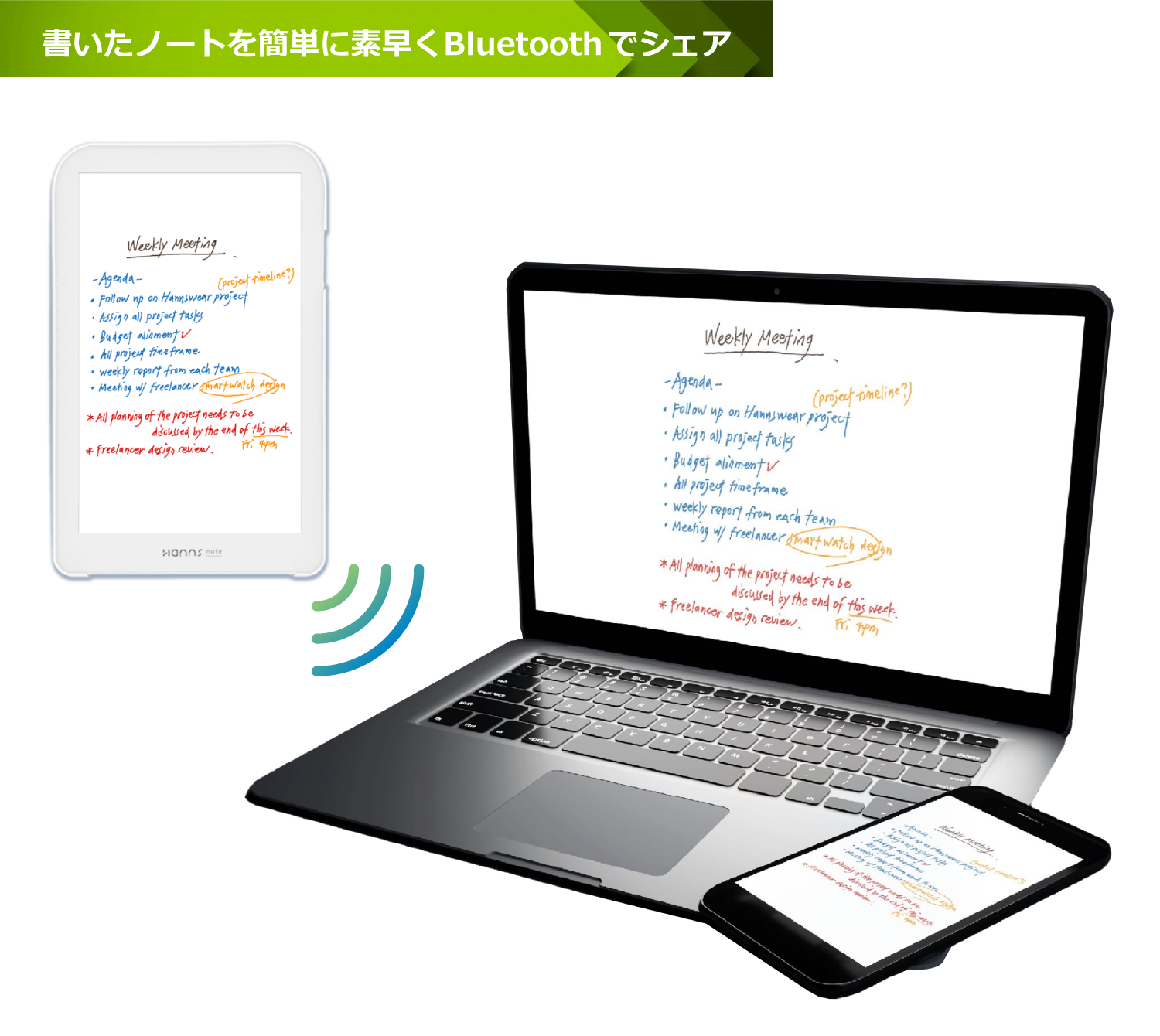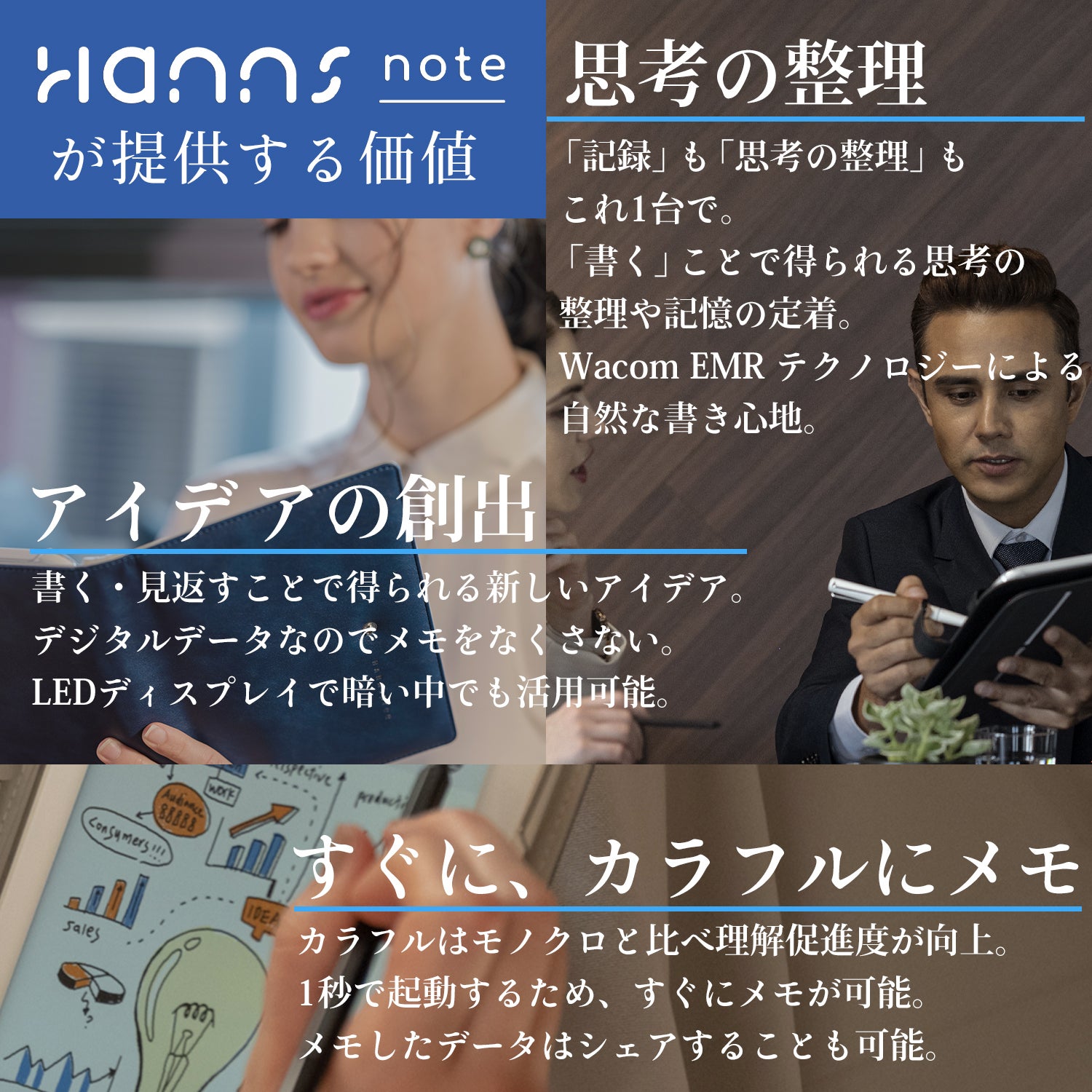 Hannsnote はHANNspree 最初のデジタルノートです。私たちのデザインアイデアは、革新的な思考を1秒で書きとめ、それをハンディノートのように簡単に、でももっとスマートに究極の色彩で、友人とアイデアを共有できることです。