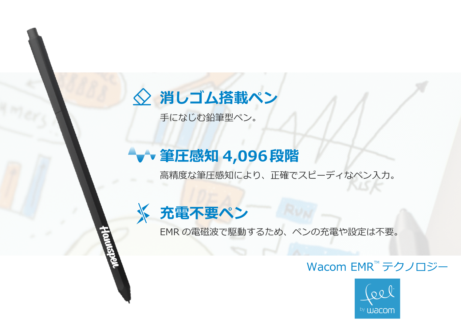 Wacom EMR Technology はペンだけでなくディスプレイにも搭載され、ほぼ遅延を感じることなくデジタルでありながらも、紙の上でペンを使うのと同様の直感的かつ自然な書き心地を実現します。