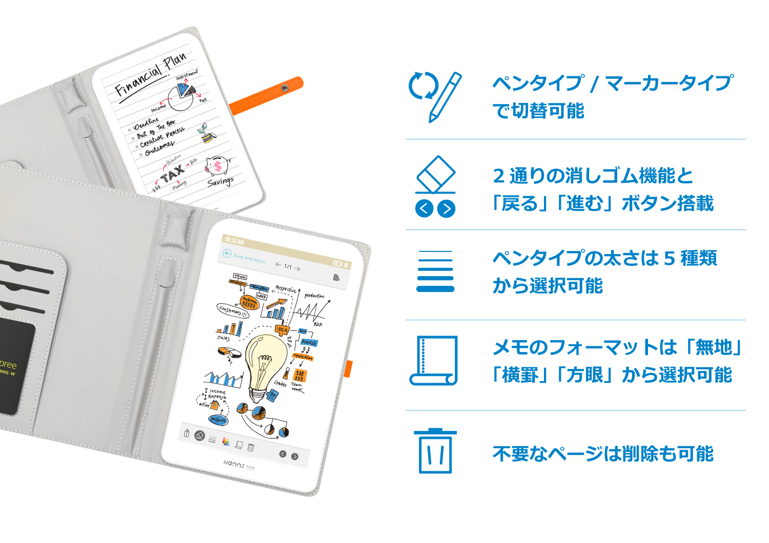 A, Hannsnote はリーダーやPDF形式には対応しておらず、ネットにもつながりません。Hannsnote はアイデア創出のサポートやカラフルにメモをすることに特化したデジタルノートです。