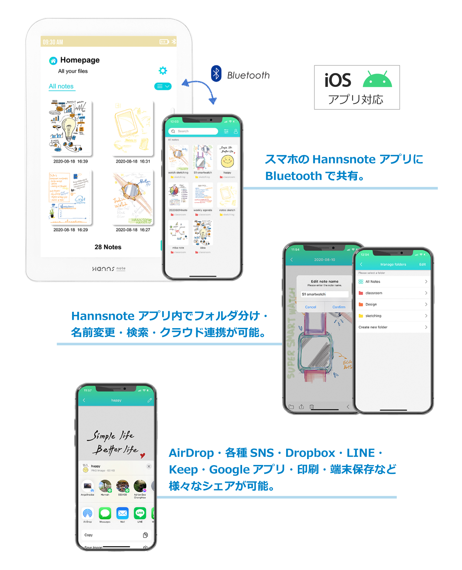 デジタルノートのデータはアプリを通してiOS・Android スマホへ。スマホのデータは様々なアプリを通してシェアすることが可能です。