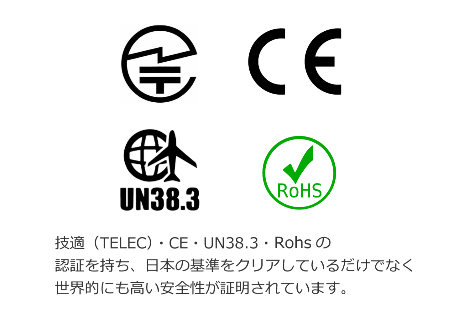 ・技適・CE・UN38.3・Rohsの認証を持ち、日本の基準をクリアしているだけでなく世界的にも高い安全性が証明されています。