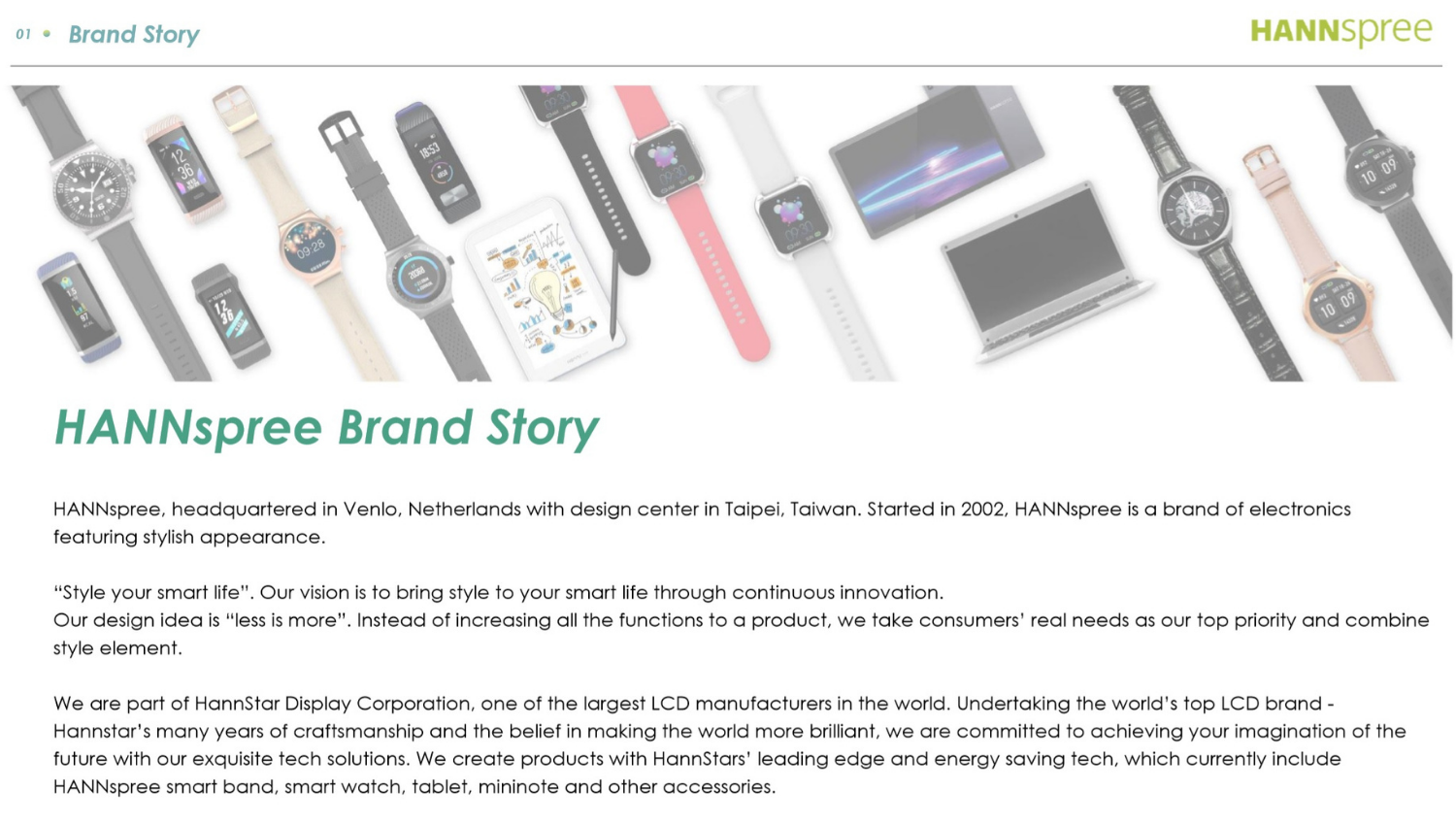 私たちは世界最大の液晶メーカーのひとつである HannStar Display Corporation の一員です。世界の液晶ディスプレイのトップブランドであるHannStar の技術と世界をより輝かせるという信念のもと、お客様の想像を実現するために私たちの技術ソリューションで未来を切り開きます。私たちはHannStar の最先端かつ省エネ技術で製品を生み出しており、現在HANNspree 製品は「スマートバンド・スマートウォッチ・タブレット・ミニノート・その他アクセサリー」があります。