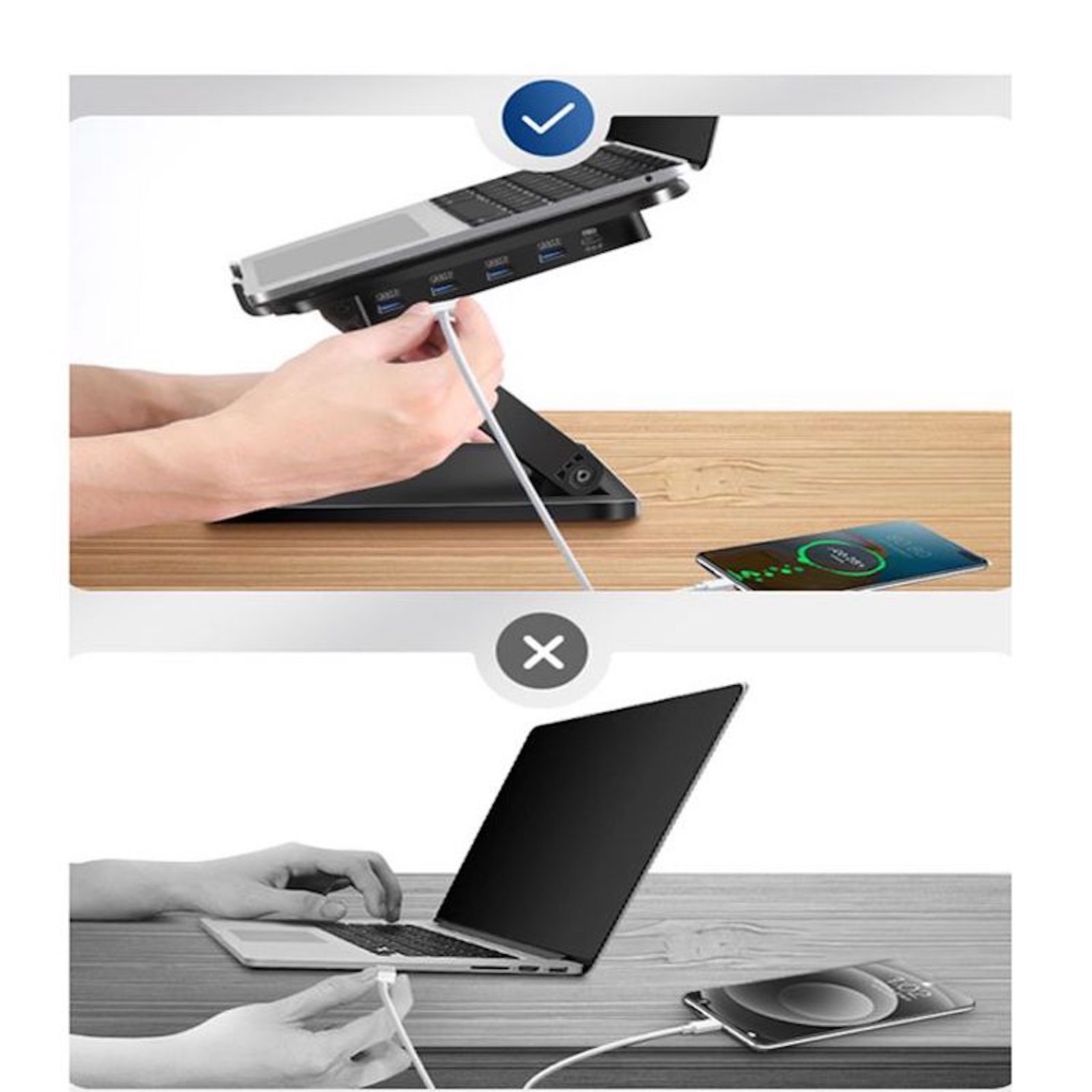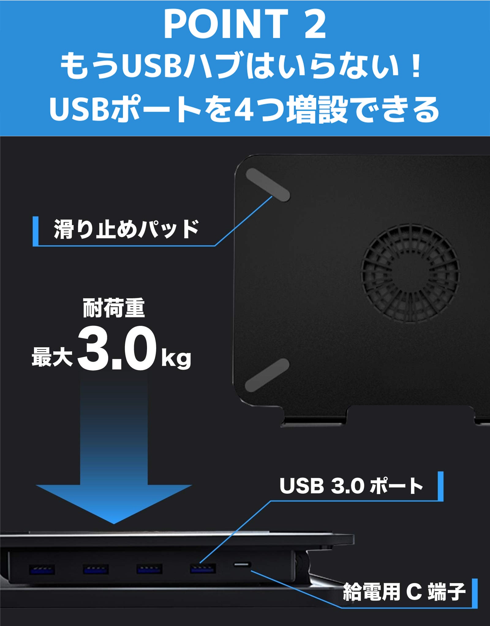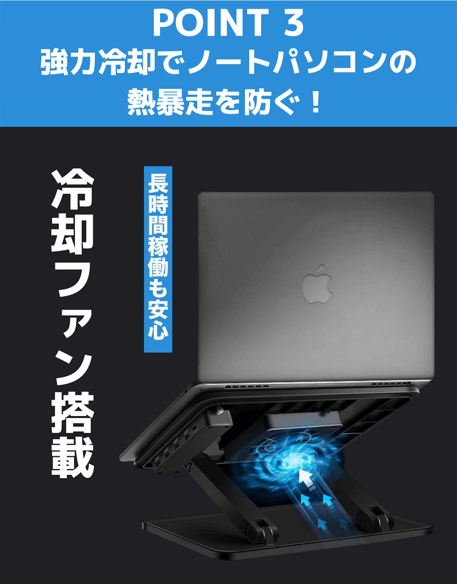 冷却ファンとUSBポートが一体となった画期的な3 in 1パソコンスタンド!
