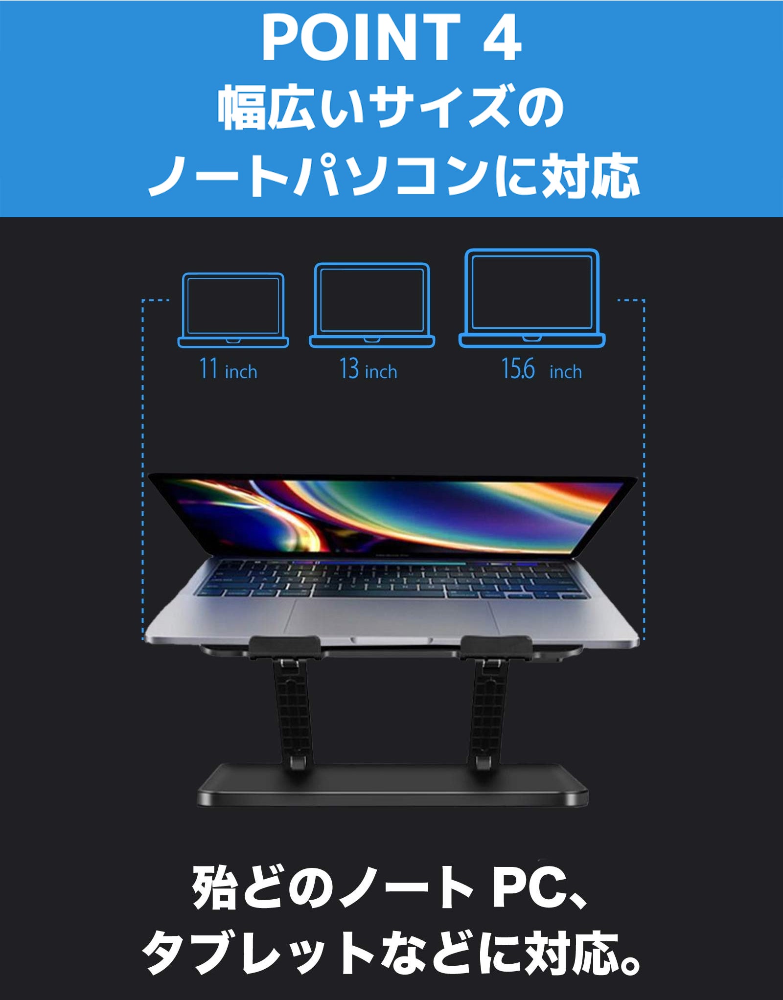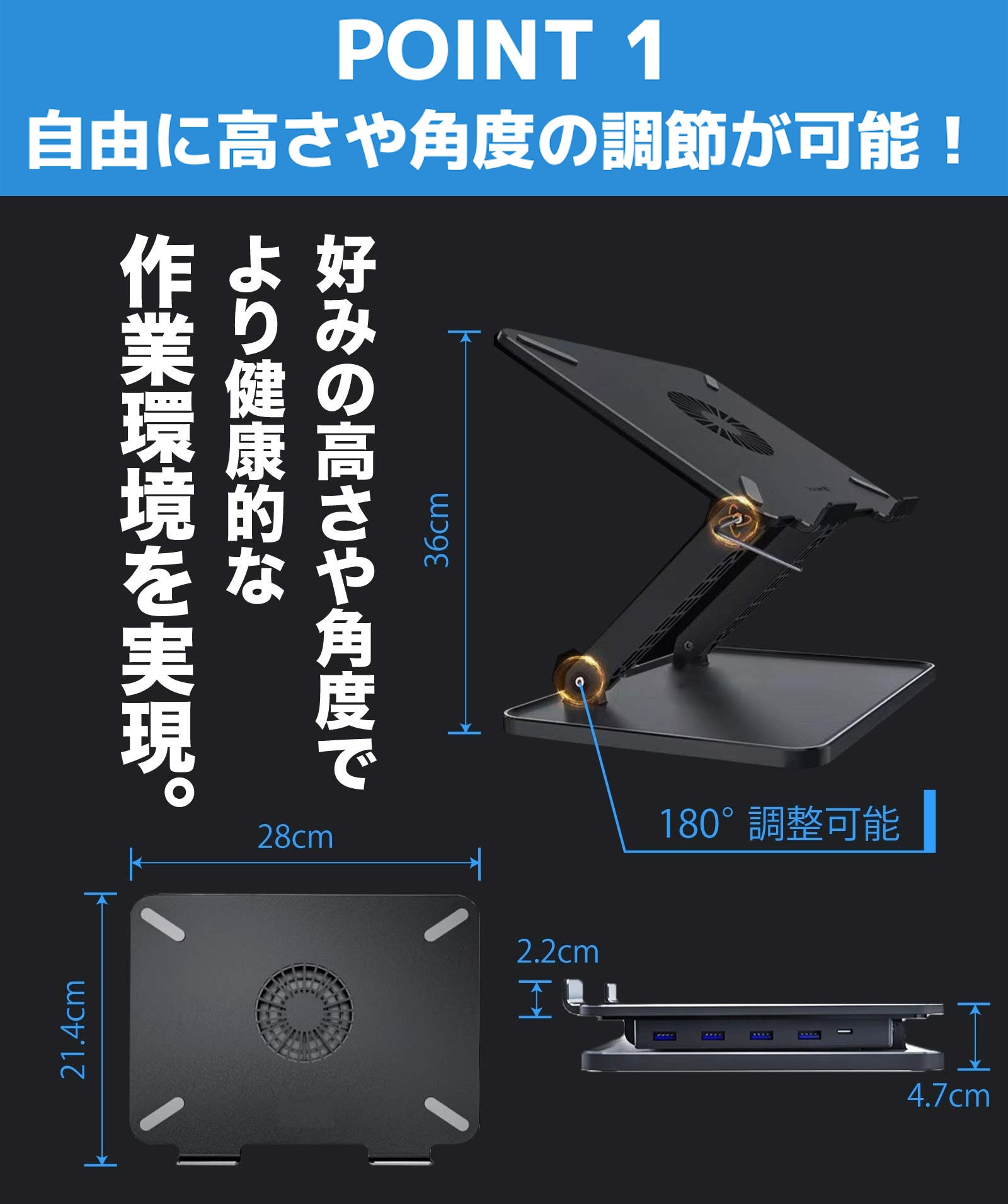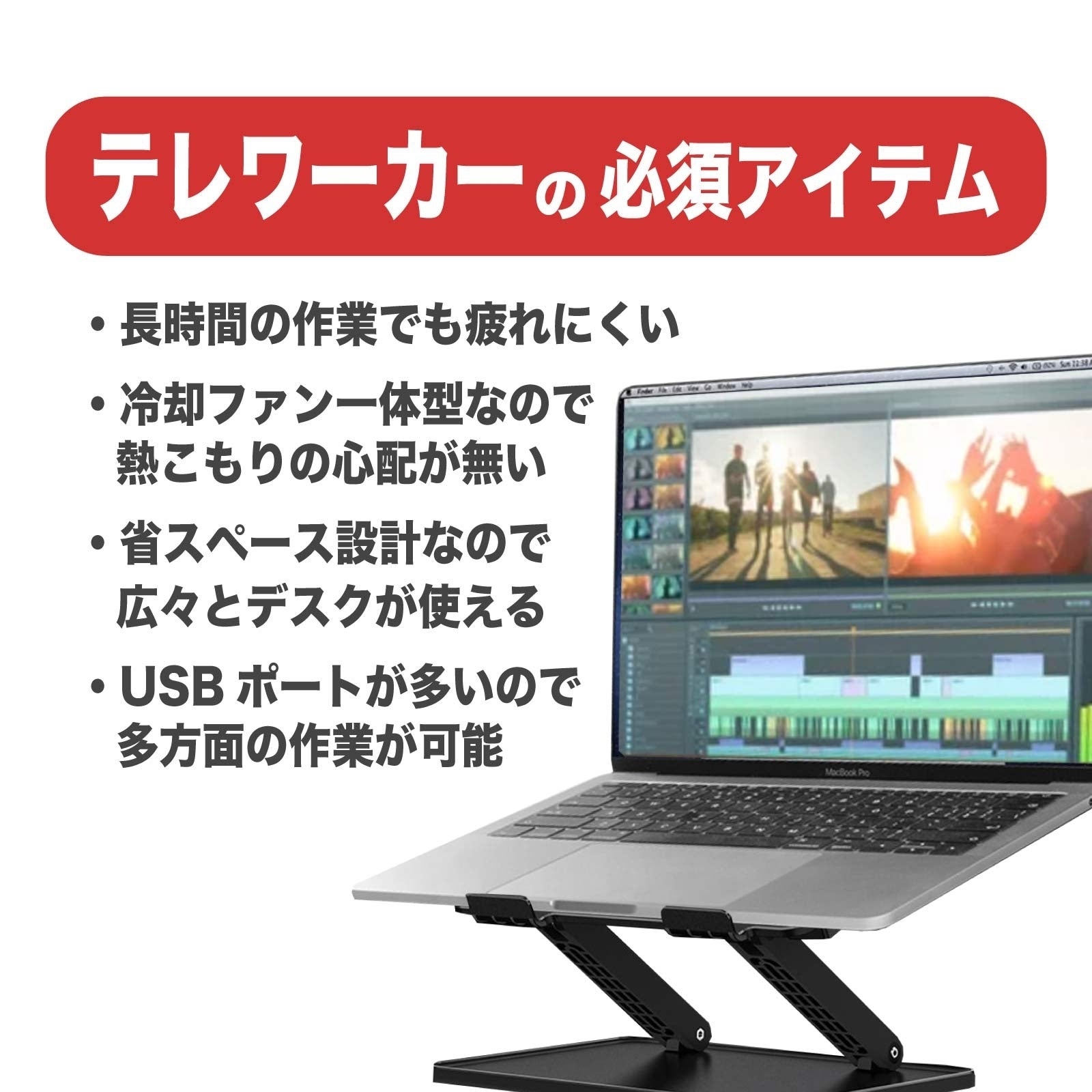 テレワークに、出張に、オフィスに!あらゆるシーンで利用できる冷却ファンとUSB HUBが一体となったノートパソコンスタンドです。0.8kgと非常に軽量でコンパクトなので、持ち運びに最適!いつでも、どこでも快適に仕事を行えます。