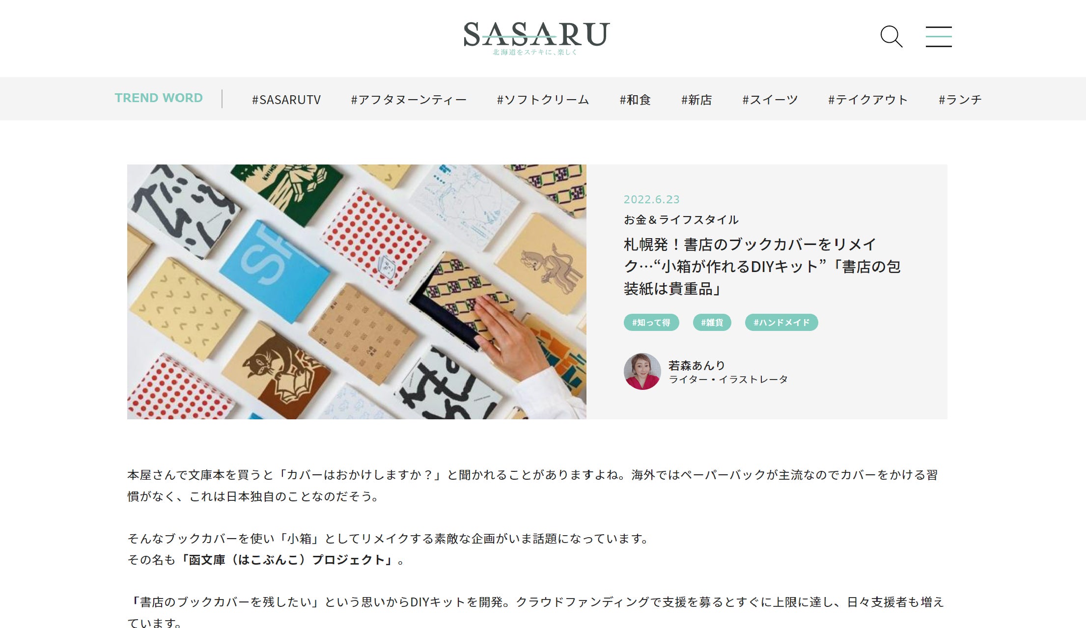 Webメディア「SASARU」は北海道のテレビ局・北海道文化放送(UHB)が運営、北海道の女性に向けてファッション・グルメ・ライフスタイルについての情報を発信しています。「函文庫」の魅力や私たちの取り組みを詳しく記事にしていただきました。