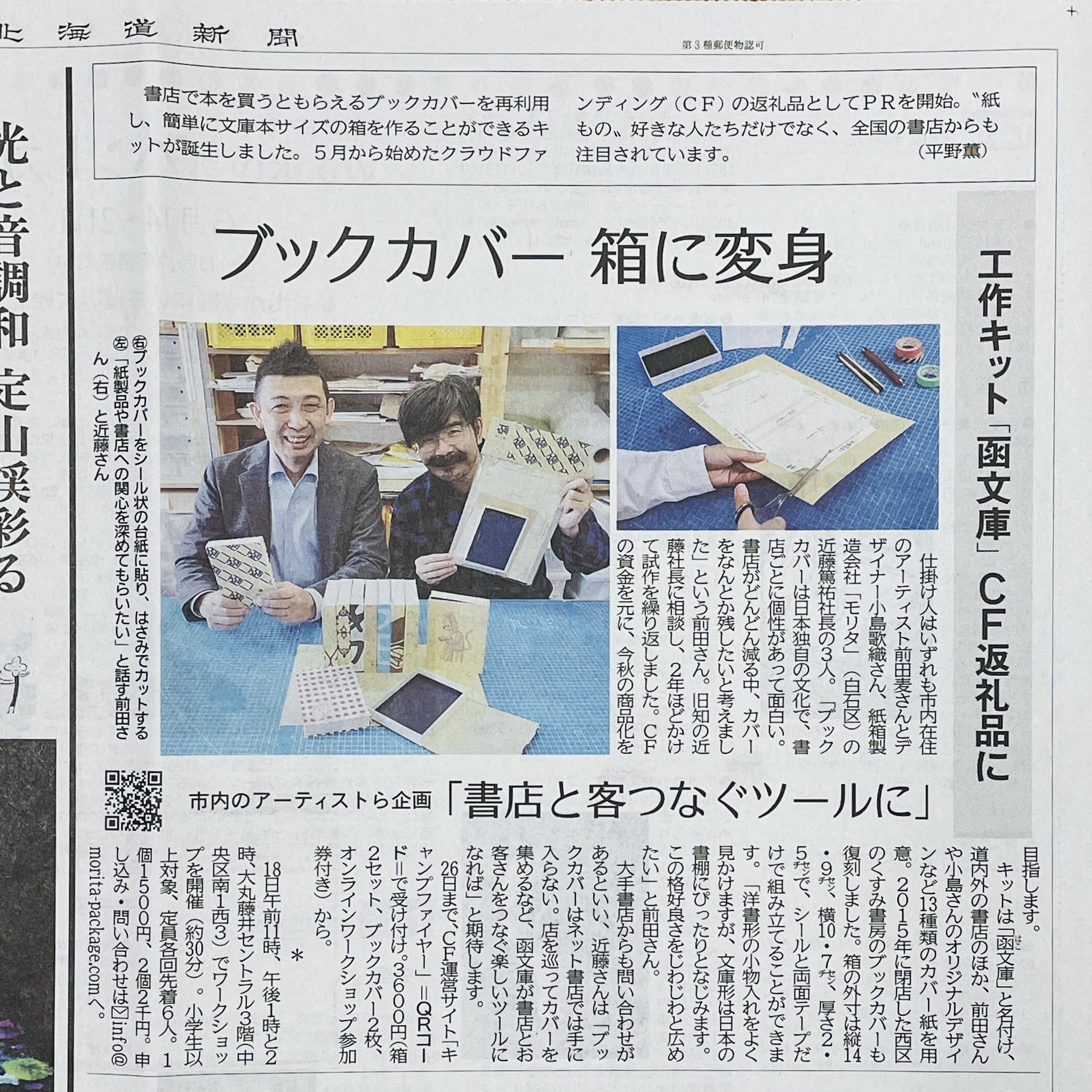 皆さま、こんにちは。いつも応援いただき、ありがとうございます。5月1日からスタートしました本クラウドファンディングですが、6月26日23:59を持って受付終了となります!ご支援いただきました方につきましては、受付終了後リターン品の製作・発送準備に掛かりますので、リターン品のお届けまでもう暫くお待ちください。もし周囲の方で「函文庫」にご興味ある方がいらっしゃいましたら、お声がけ頂けますと幸いです。お蔭さまで、クラウドファンディングをスタートしまして、地元でのワークショップ開催や新聞掲載いただいたり等により反響をいただいております。まだ具体的にはお伝えできないのですが、大手書店様とのコラボ企画のオファーも頂いている処です。ワークショップ等により、「ブックカバーが箱にする体験」をされた方からは「楽しい」「お気に入りのブックカバーをカタチにする事ができて嬉しい」と言った反応を頂戴しています。「函文庫プロジェクト」に対するポテンシャルを実感しています。本日含めて残り5日間、より多くの方に「函文庫」のことを知って頂きたいと思います。引き続き応援のほど、よろしくお願いいたします!