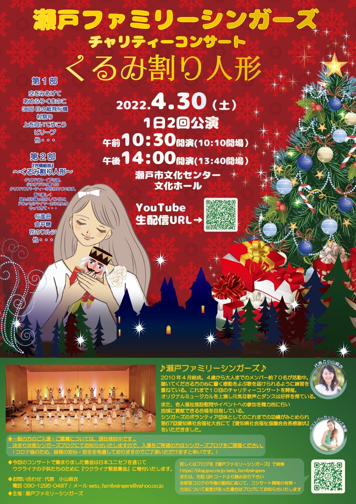2022/05/10 02:22瀬戸ファミリーシンガーズチャリティーコンサートくるみ割人形あたたかい拍手に包まれて無事にコンサートが終わりました昨年はコロナの影響で家族限定だったコンサート。今年は一般のお客様にもご来場いただくことができ、たくさんの拍手の中でコンサートを行うことが出来ました。やはり聞いてくださるお客様がいらっしゃるのは幸せなことです。拍手に後押しされ、のびのび歌うことが出来ました。今年もゲストで来ていただいた美郷さんが大活躍!リズム遊びや、二部では「アフリカからきましたー!」と躍動感溢れる太鼓でお客様を魅了。合唱もたくさん盛り上げていただきました!!大きな舞台でメンバーのキラキラ輝く姿を見ることが出来てとても幸せな時間でした。お客様の拍手があるってとてもありがたいですね。昨年よりずっとずっと笑顔が増えたな。と感じました。二回目の最後の舞台は私もいろいろな思いが込み上げ娘のことも含めお話してしまい、たくさんの方の優しさを思いだし思わず涙してしまいました。コロナ渦にあっても歌うことを続けてやりずらいオンラインでも、マスクでとても歌いにくくても努力し続けたメンバーのことを誇りに思います!!この経験が大きな力になると信じています!!スタッフとして支えてくださいました皆様、会場に足を運びたくさんの拍手をくださった皆様、オンラインで応援してくださった皆様、その他たくさんの企業様からのご支援をいただき、本当にありがとうございました。たくさんのあたたかいメッセージをいただきありがとうございました。現在もコンサートの模様をアーカイブで限定公開中です。~5月31日までです。ぜひご覧ください♪YouTubeアーカイブ配信URL14:00公演https://youtu.be/CpnqFDlXnU410:30公演https://youtu.be/s8JL6dTgIfI今後もこのようなコンサート活動を続けていくためにクラウドファンディングを行っています。どうぞあたたかいご支援をよろしくお願いします。瀬戸ファミリーシンガーズチャリティーコンサート♪絶やさない!音楽の力!愛知県で活動している合唱団「瀬戸ファミリーシンガーズ」による、チャリティーコンサートのご支援をお願い致します。2022年4月30日(土)瀬戸市文化センター文化ホールにおい...これからも瀬戸ファミリーシンガーズを応援よろしくお願いします。 もっと見る