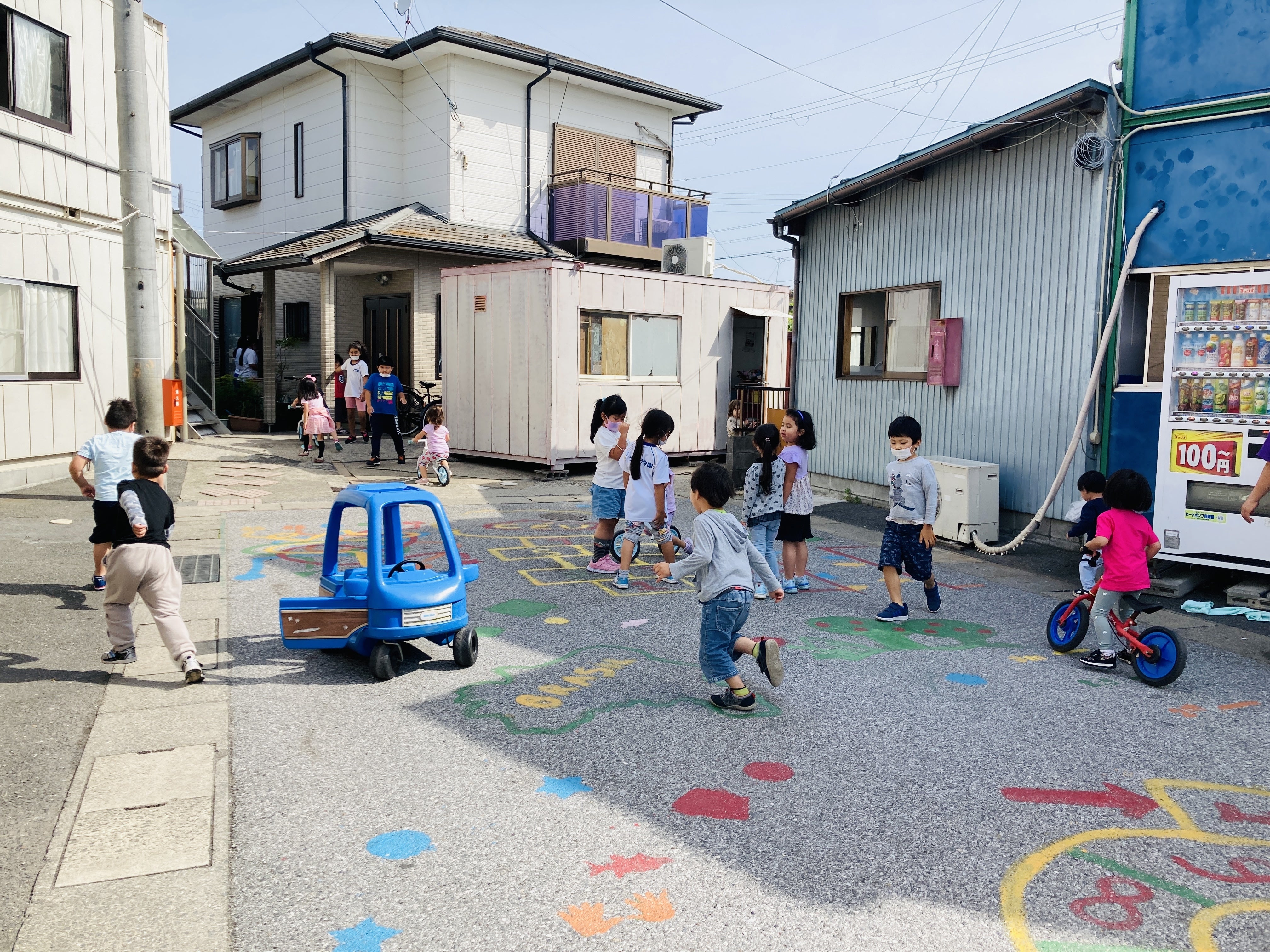 サンタナ学園は今日もみんな元気です。日差しは強くなってきましたが、過ごしやすい気候なので、子どもたちは大好きな外遊びができてとても嬉しそうです。園前の道路で、小さい子たちは走り回ったり乗り物に乗って遊びます。小さい子たちが教室に入ると、中高生が円陣を組んでバレーボールをします。